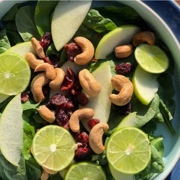 Espinaca, manzana verde, nuez de la india y arándanos con aderezo balsámico.