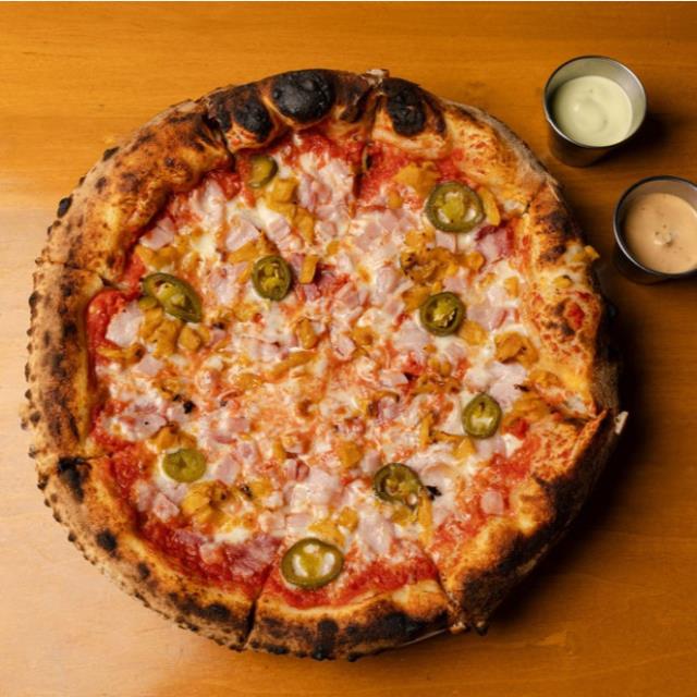 Salsa pomodoro, mozzarella, jamón de pierna, tocino, piña y chiles jalapeño.