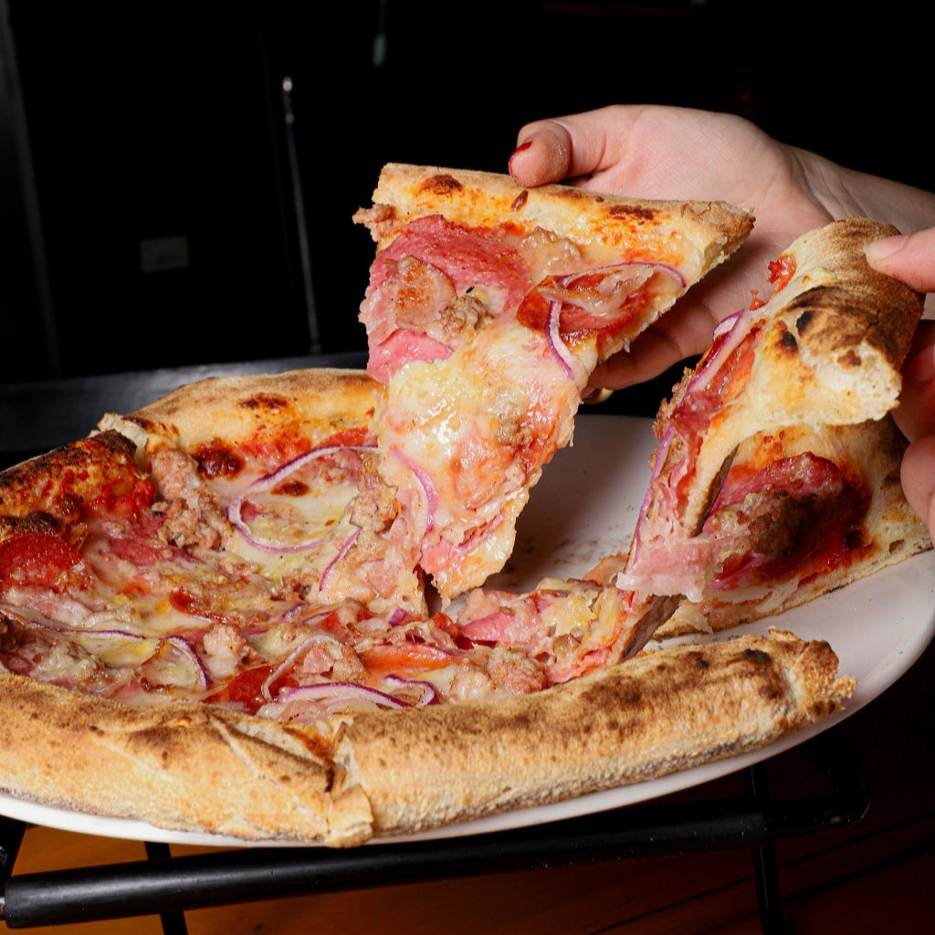 Salsa pomodoro, pepperoni, mozzarella, queso fontina, salchicha italiana, salami, tocino y cebolla.
