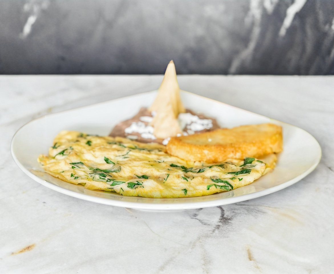Omelette preparado al gusto con queso e ingrediente favorito a elegir, acompañado de deliciosos chilaquiles y frijoles refritos ademas de tortillas o pan tostado y Salsa