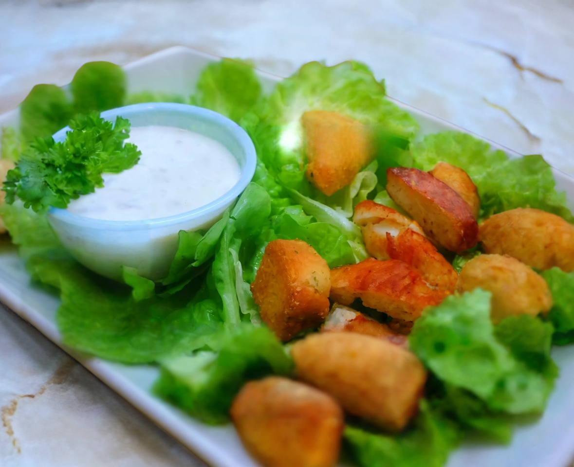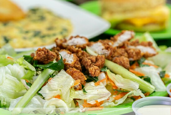 Lechuga, Espinaca, Zanahoria, Bastoncitos de apio, Aceite de Oliva, Trocitos de Pechuga de pollo empanizados, acompañada de salsa de alitas y aderezo Ranch