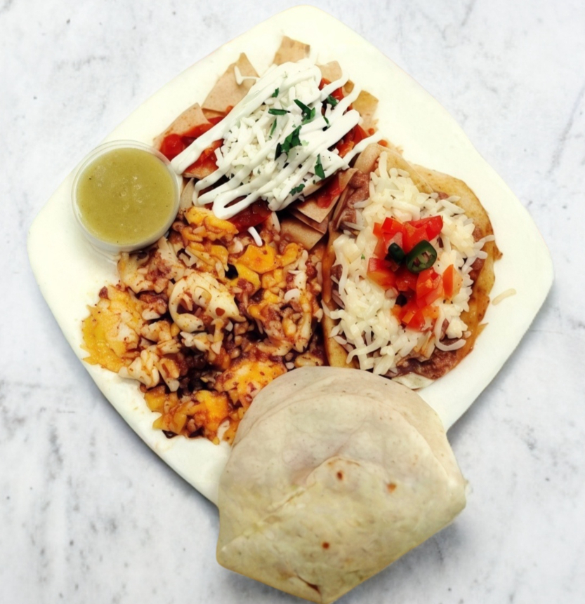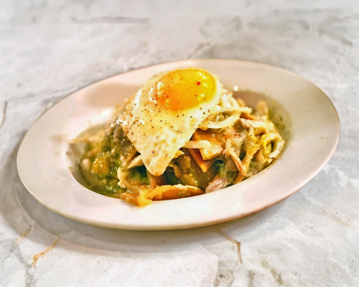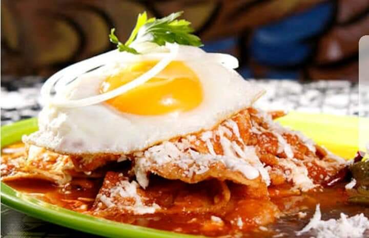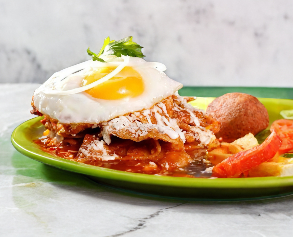 Totopos revueltos con huevo, chile, chile tomate y cebolla, bañados en nuestra deliciosa salsa verde o roja a elegir, queso y crema, acompañados de frijoles refritos