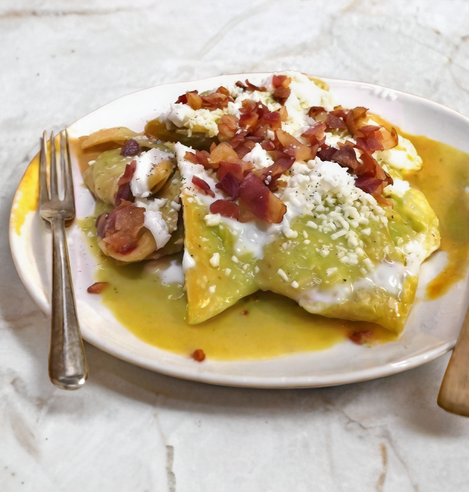 Deliciosa Tortilla frita, Bañadas en nuestra deliciosa Salsa verde o Roja, Tocino, Crema y queso Panela y Aguacate, acompañados de frijoles refritos