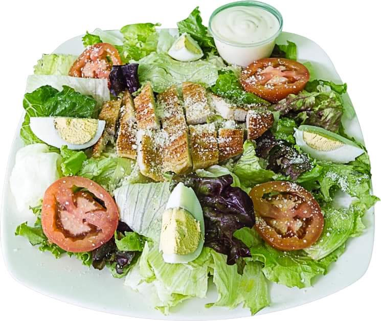 Lechuga, Jitomate, zanahoria, Aceite de Oliva, Vinagreta de Manzana, huevo cocido, queso parmesano y pollo a la plancha, acompañada de Aderezo Ranch