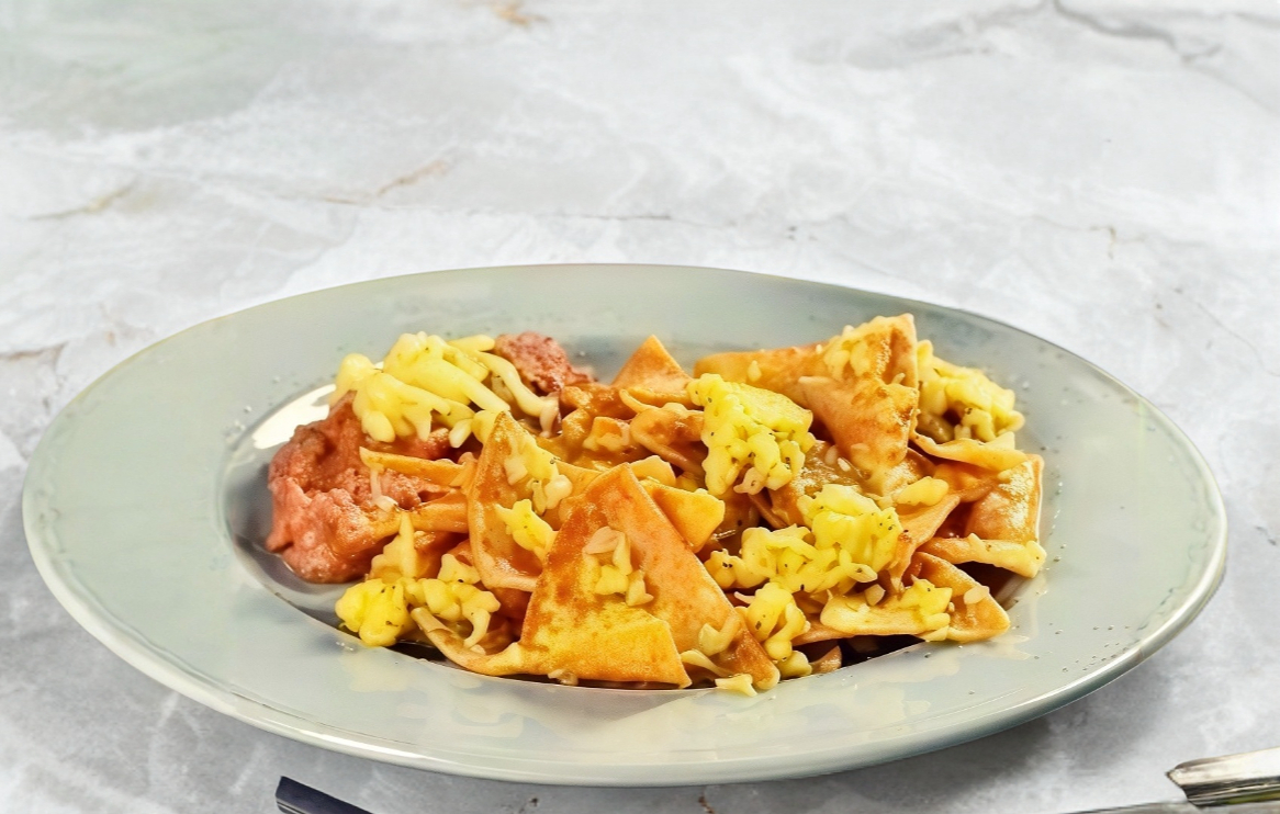 Totopos revueltos con huevo y chorizo, bañados en una de nuestras deliciosas salsas queso gratinado y crema, acompañados de frijoles refritos