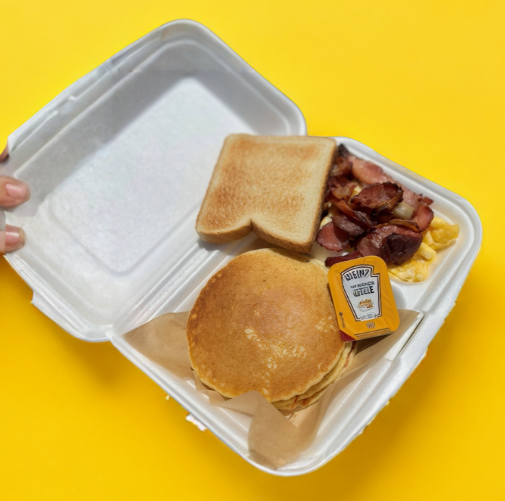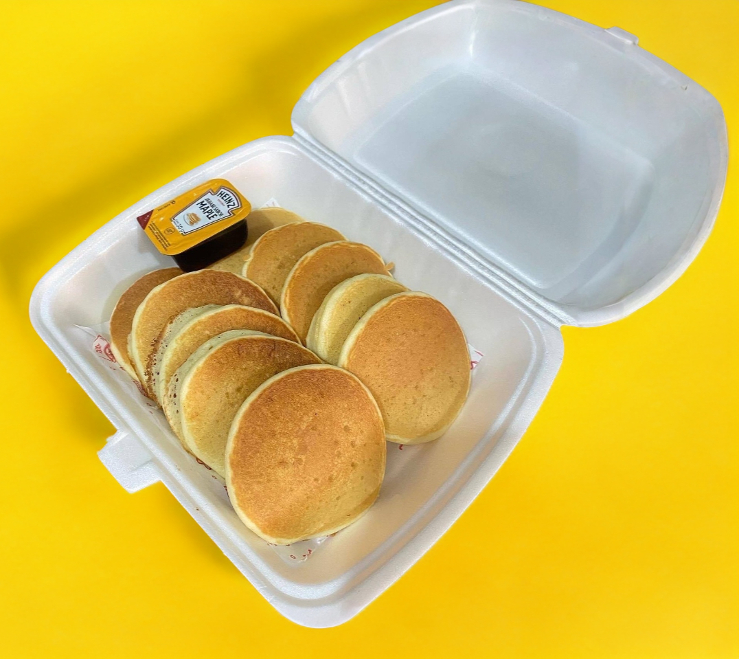 3 piezas de hotcakes con maple, tocino doradito, 2 huevos revueltos, 1 pan integral tostado y bebida