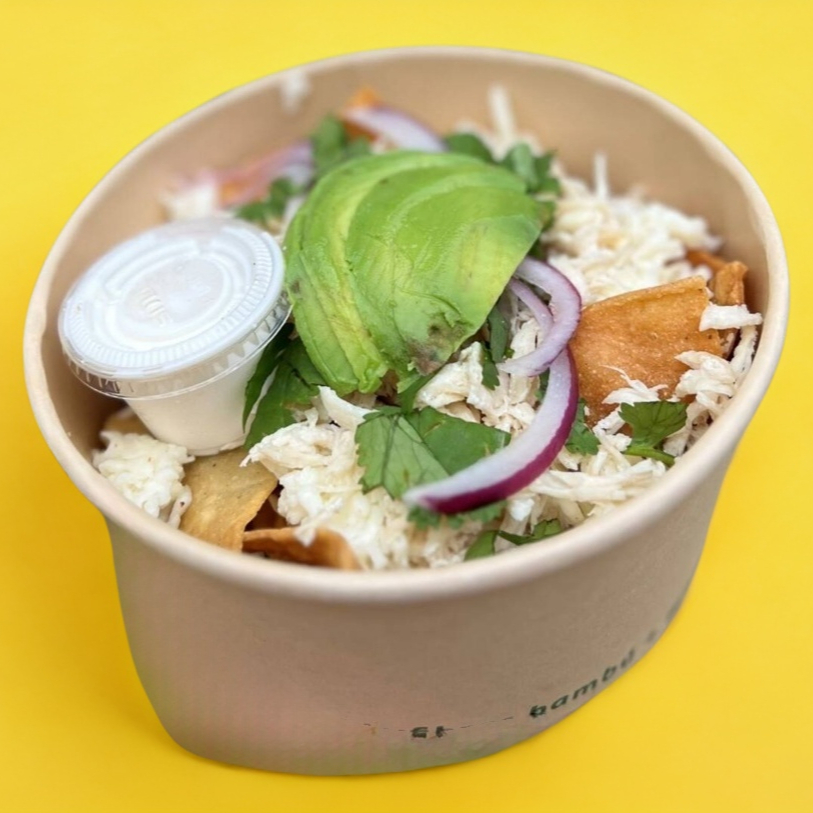 Bowl con totopos caseros, salsa verde, queso a elegir, decorados con cilantro, aguacate y cebolla morada y crema (se envia la crema y salsa a parte)