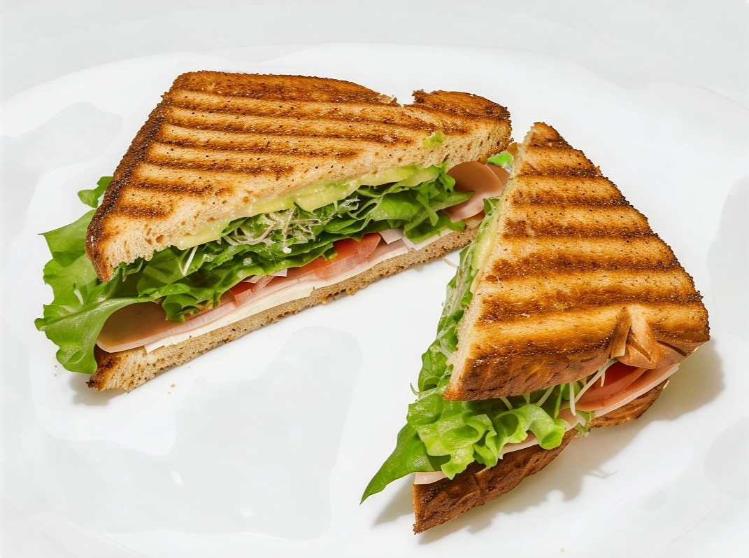 Pan 12 granos, jamón de pavo, queso panela, lechuga, tomate, cebolla morada, aguacate y mayonesa