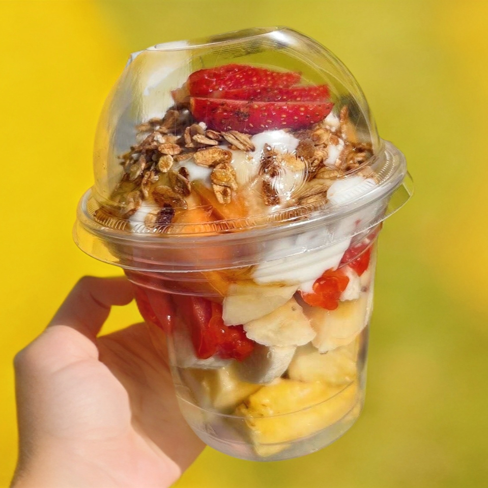 Frutas de temporada con yogurt, granola y miel de abeja