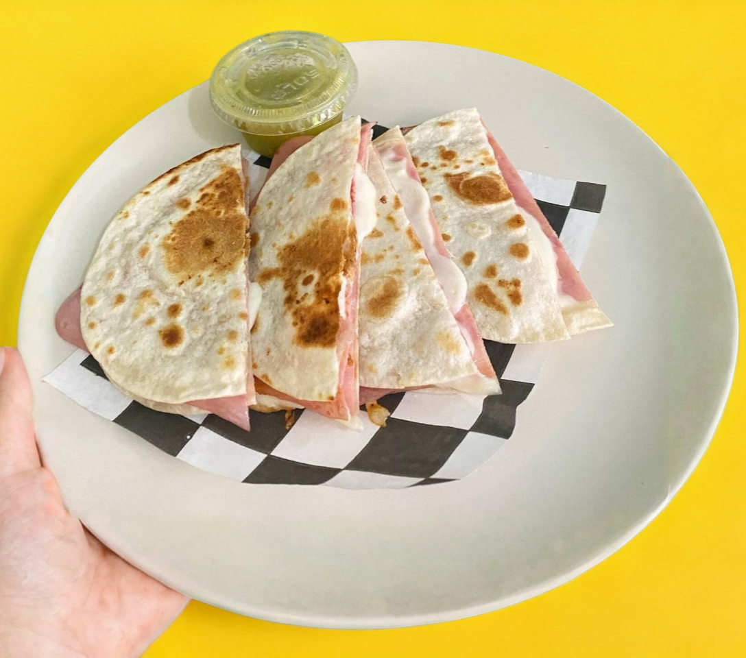 2 huevos, jamon de pavo, queso manchego, 1 pan tostado, frijoles refritos y salsa