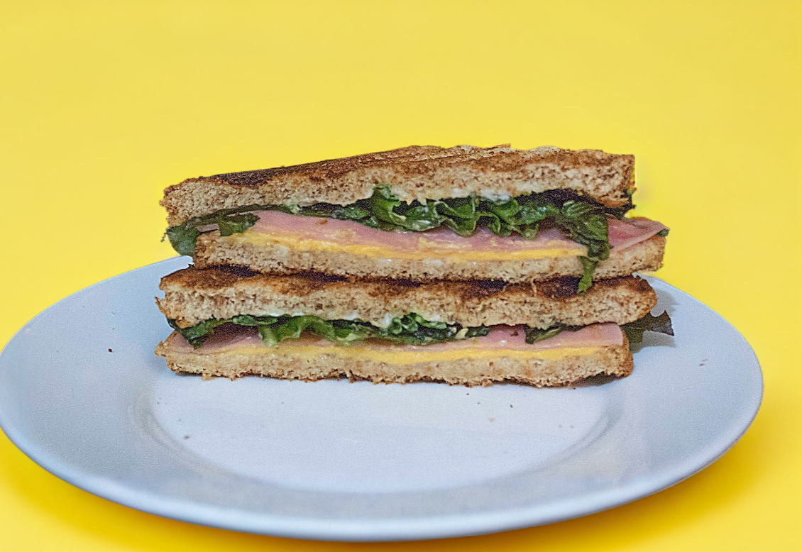 Pan 12 granos, 2 huevos, jamon de pavo, queso gouda y amarillo