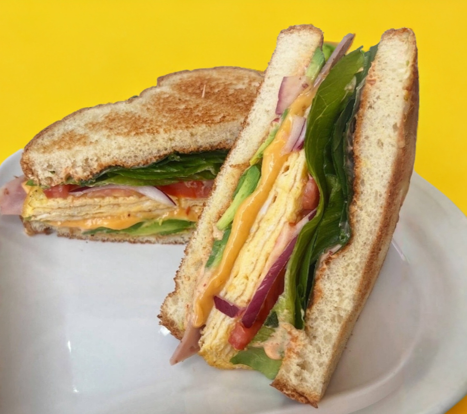Pan brioche, mayo-chipotle, jamon, queso americano, 2 huevos en omelette, lechuga, aguacate, cebolla y tomate