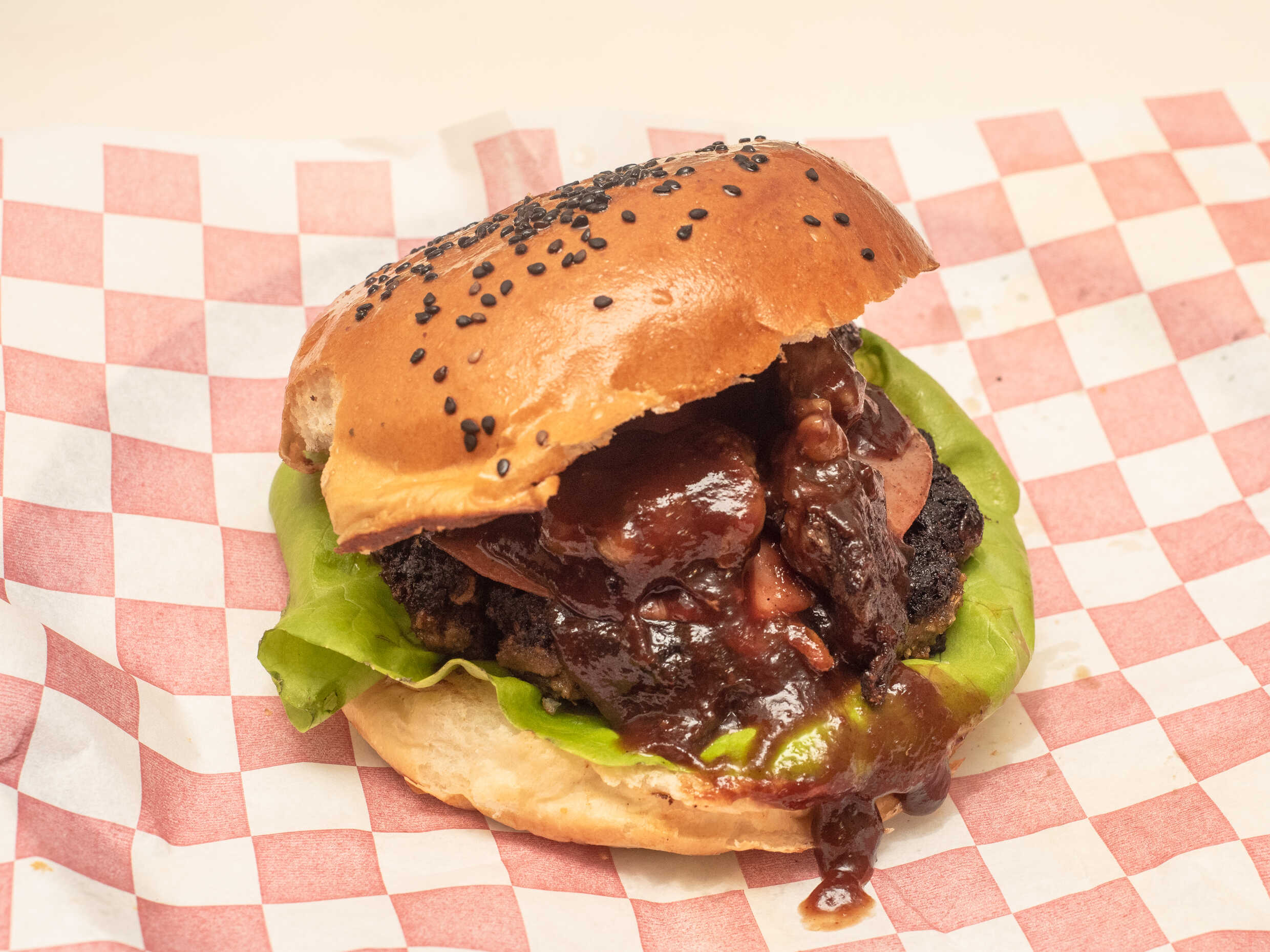 Jugosa carne con queso amarillo, topping de tocino, aros de cebolla y bbq con redución de cerveza obscura y un toque de café, chile morita y manzana verde.