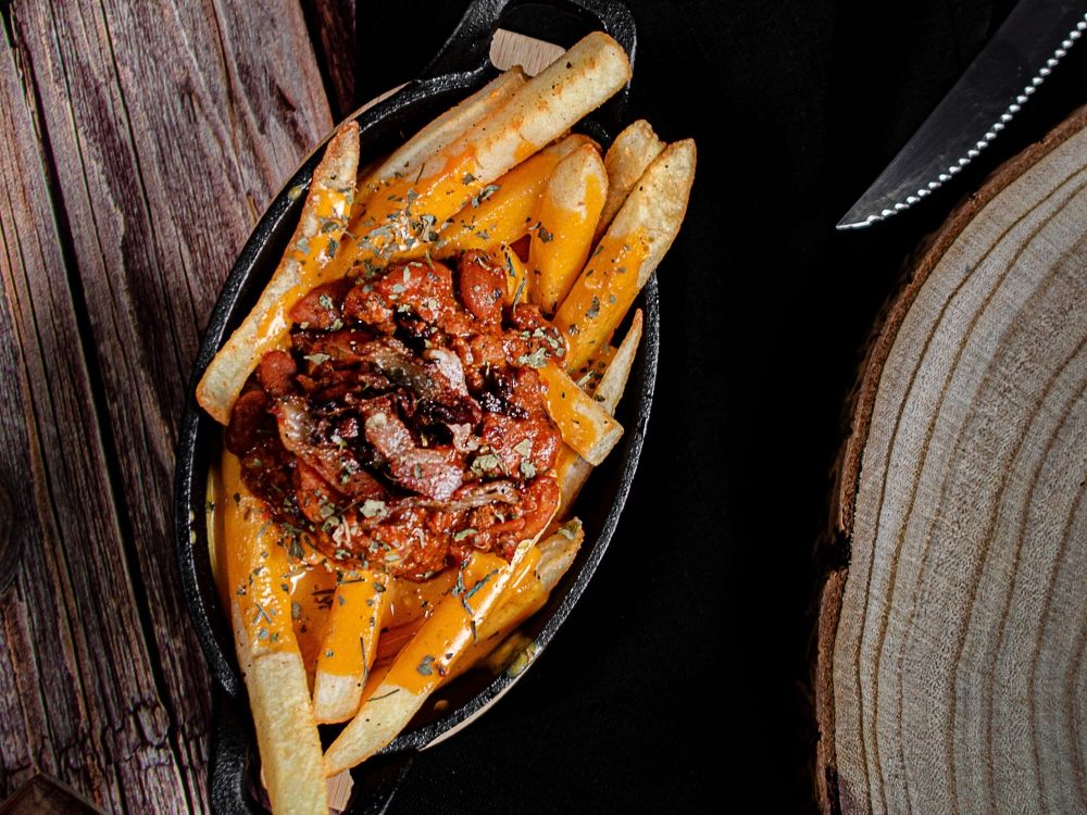 Orden de 180 gr de papas bañadas en salsa de 5 quesos con chili beans.