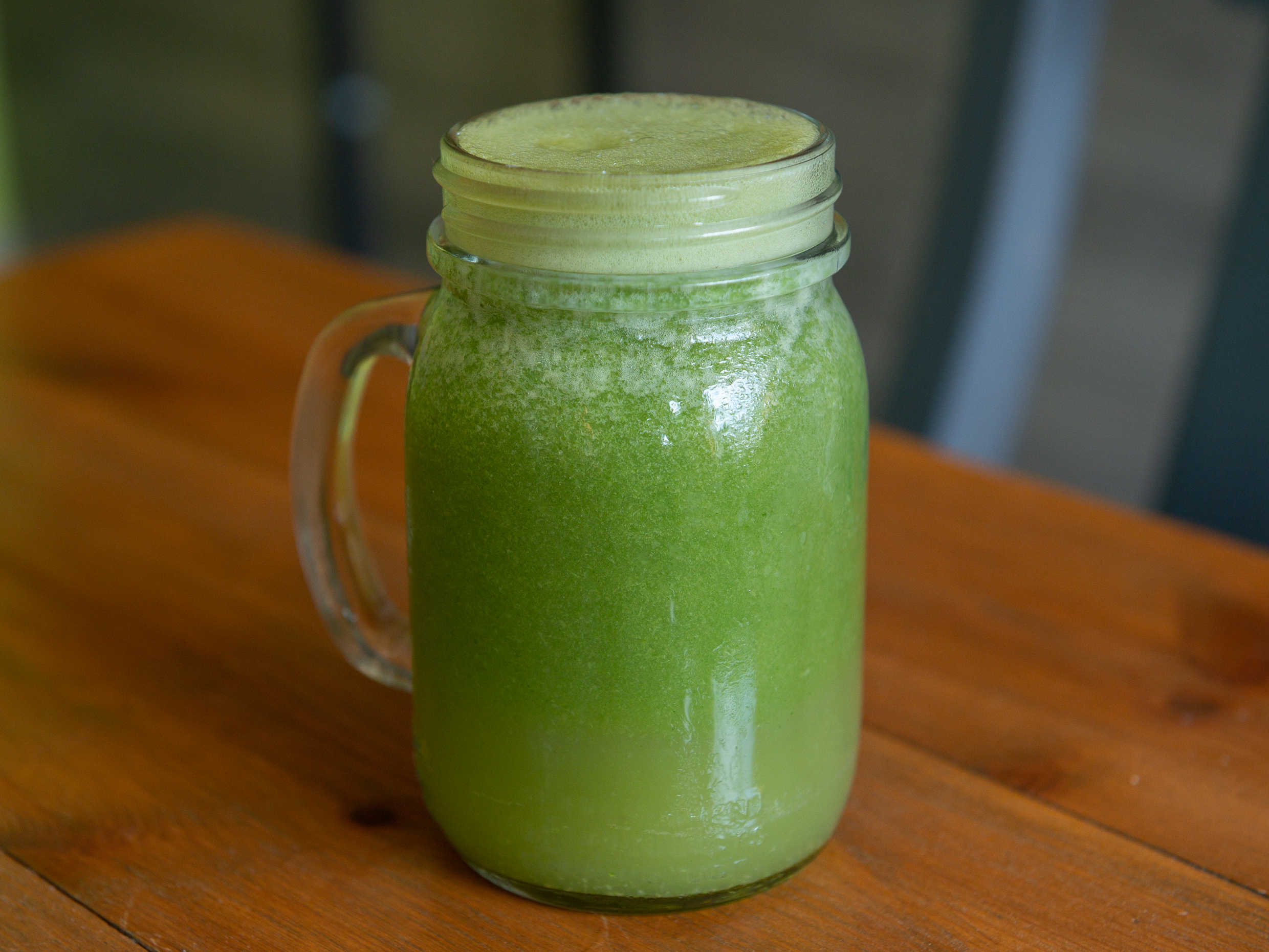 Mitad de jugo de naranja la otra parte fruta con yogurt granola y miel