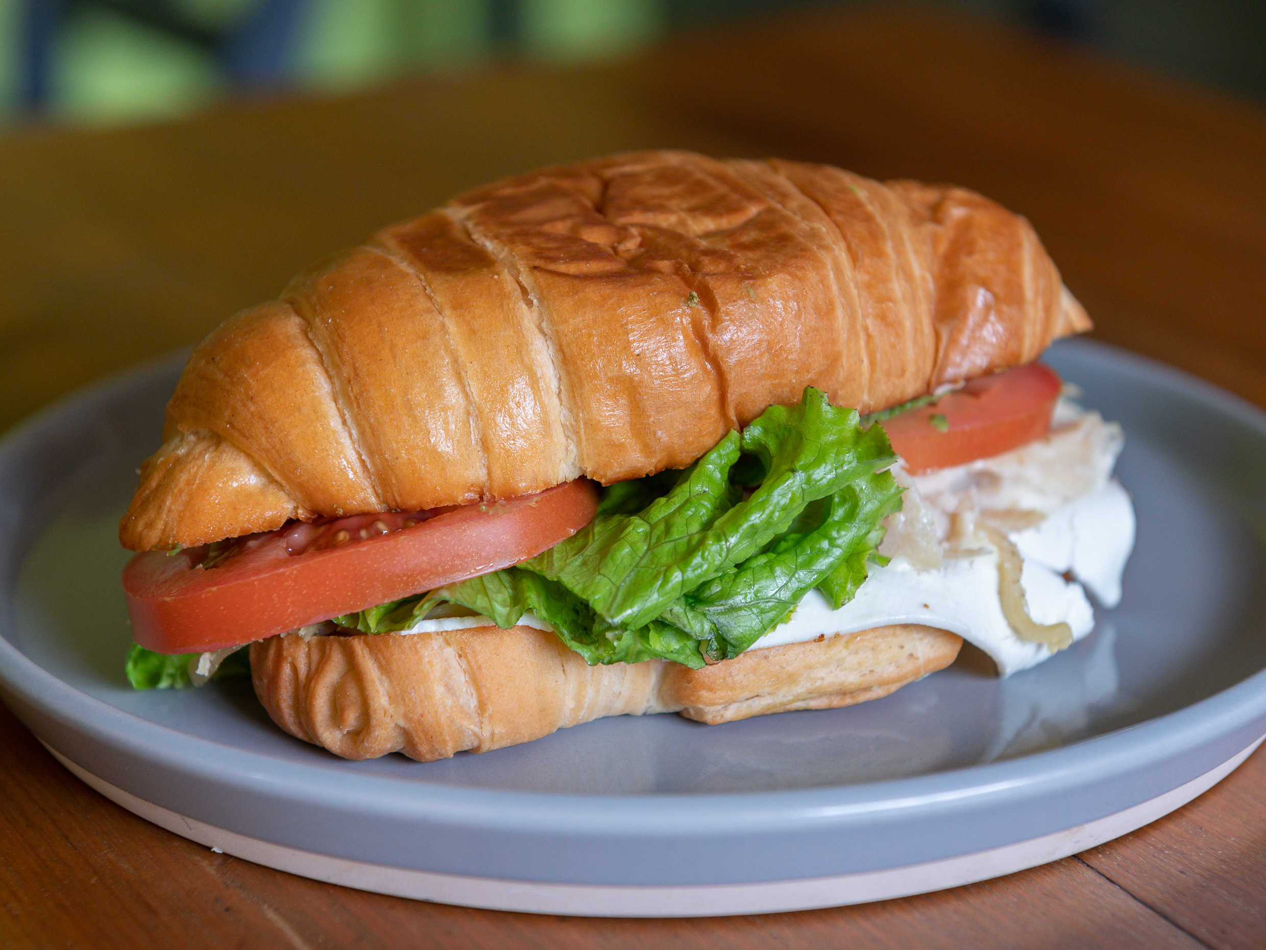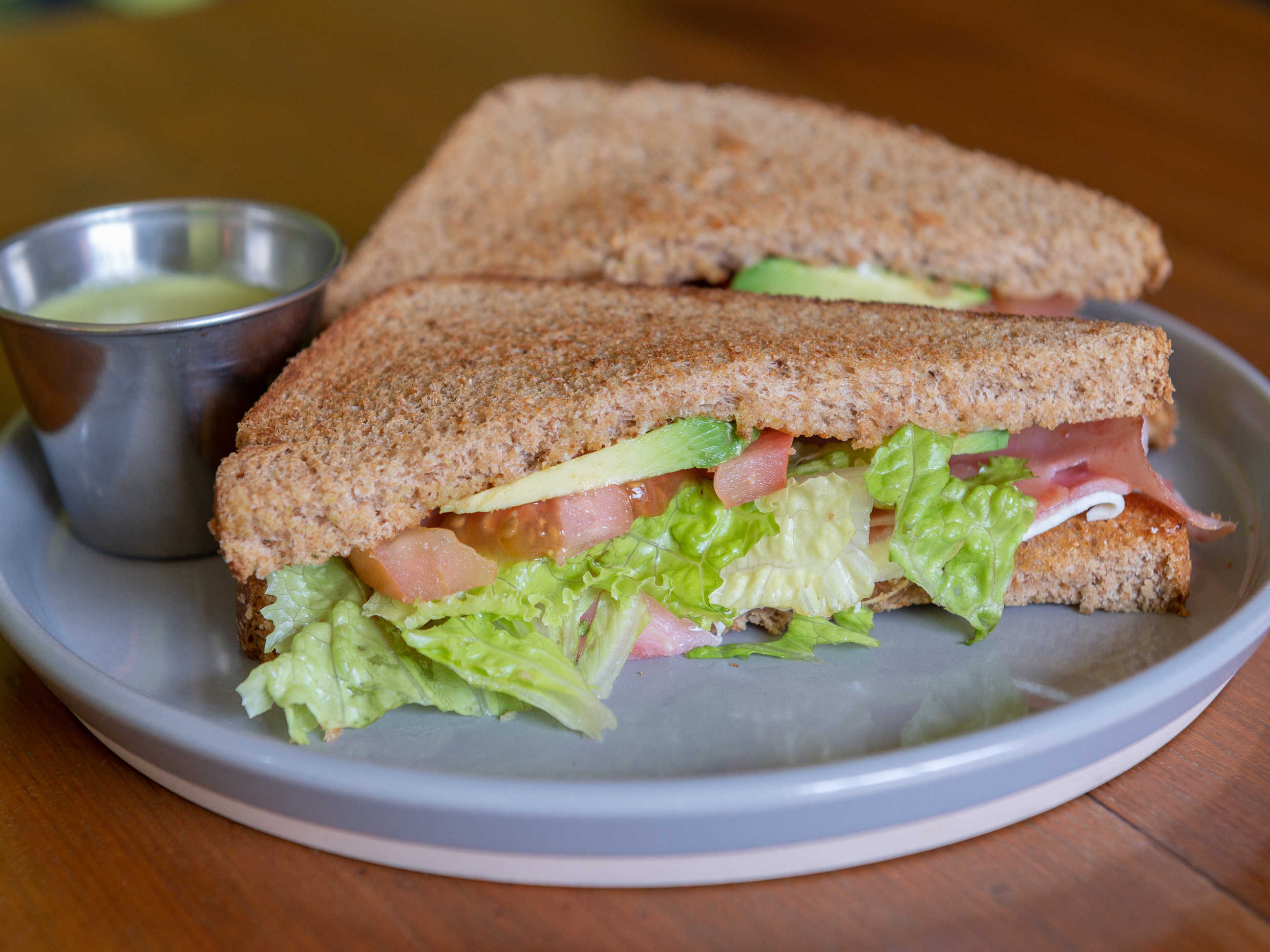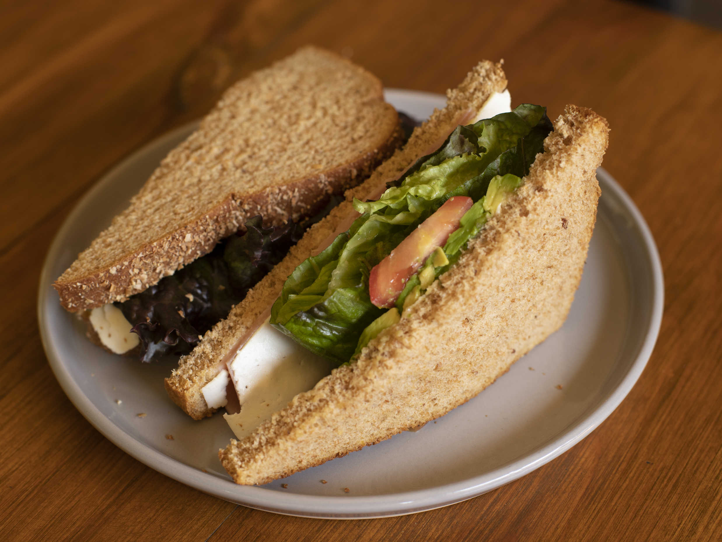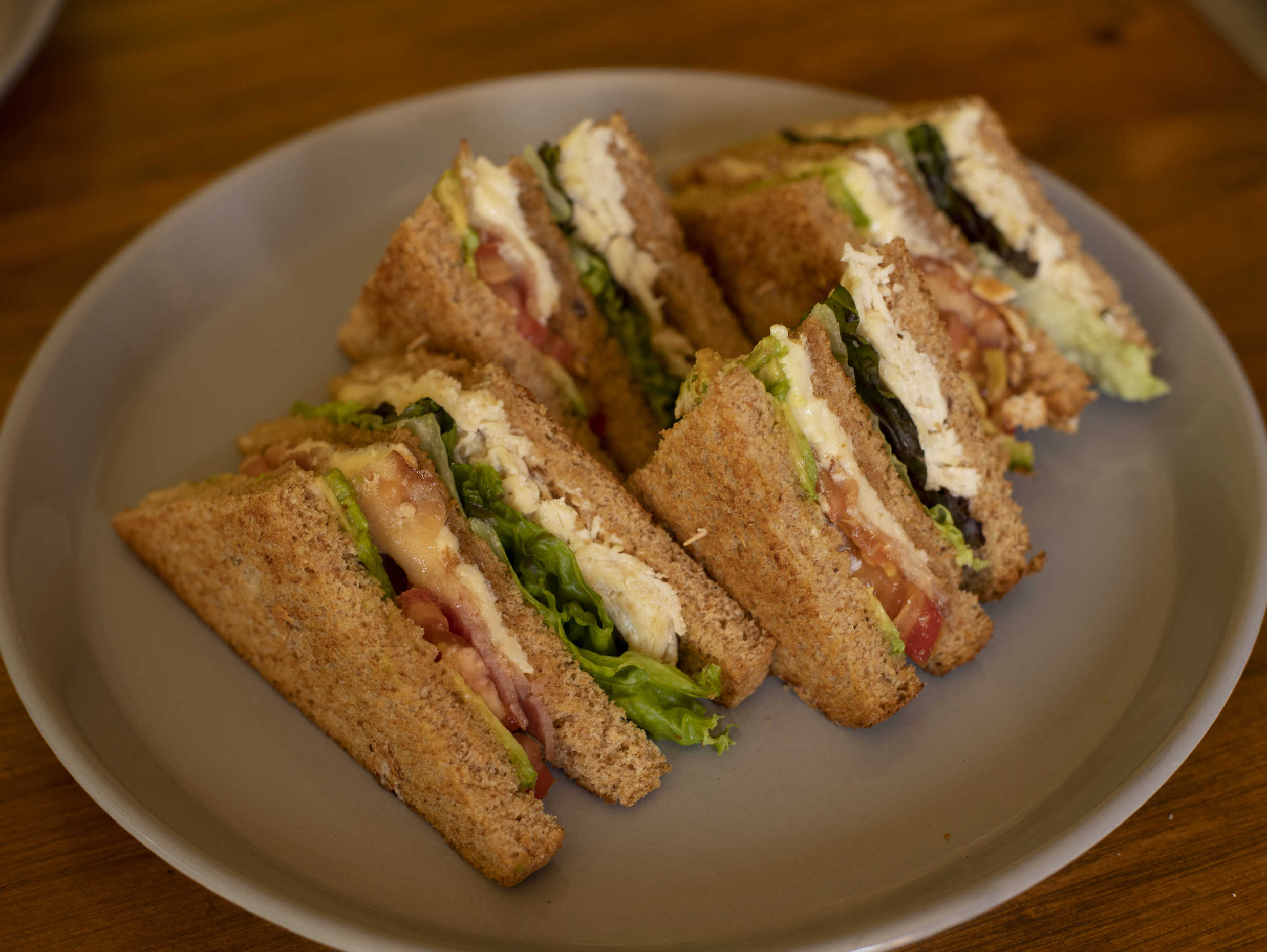 De tres niveles, con pechuga de pollo, tocino, aguacate, queso mozzarella, lechuga y tomate