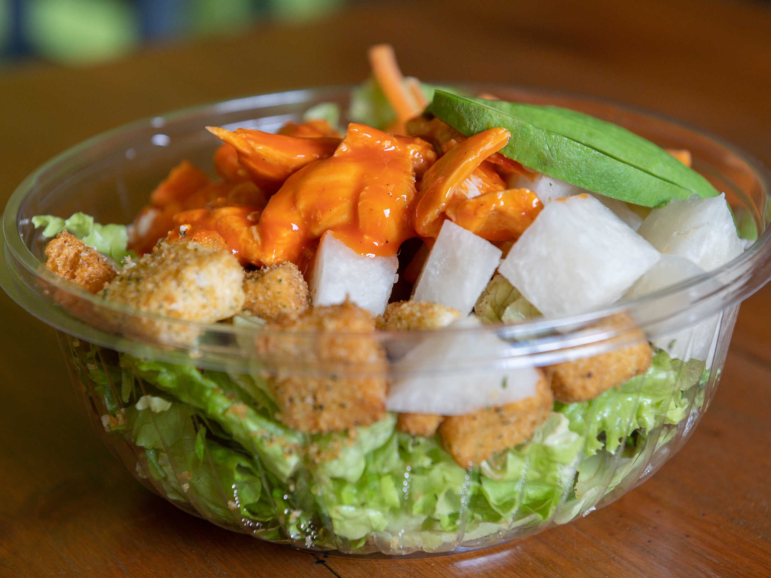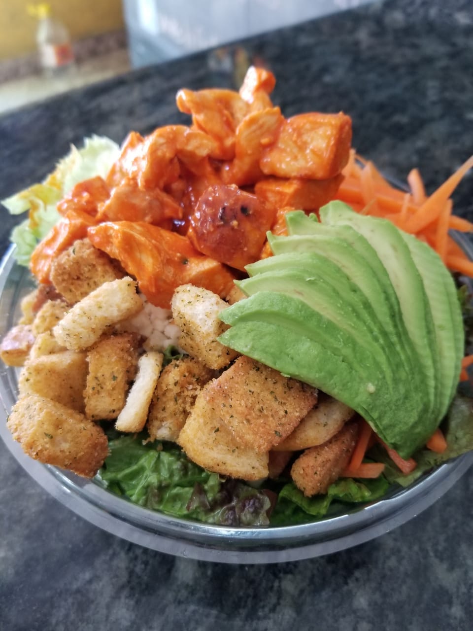 Mezcla de lechugas, bastones de zanahoria, jícama y aguacate, con pechuga a la plancha bañada con salsa búfalo
