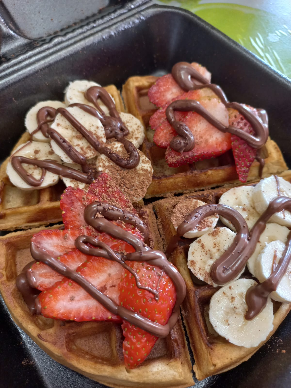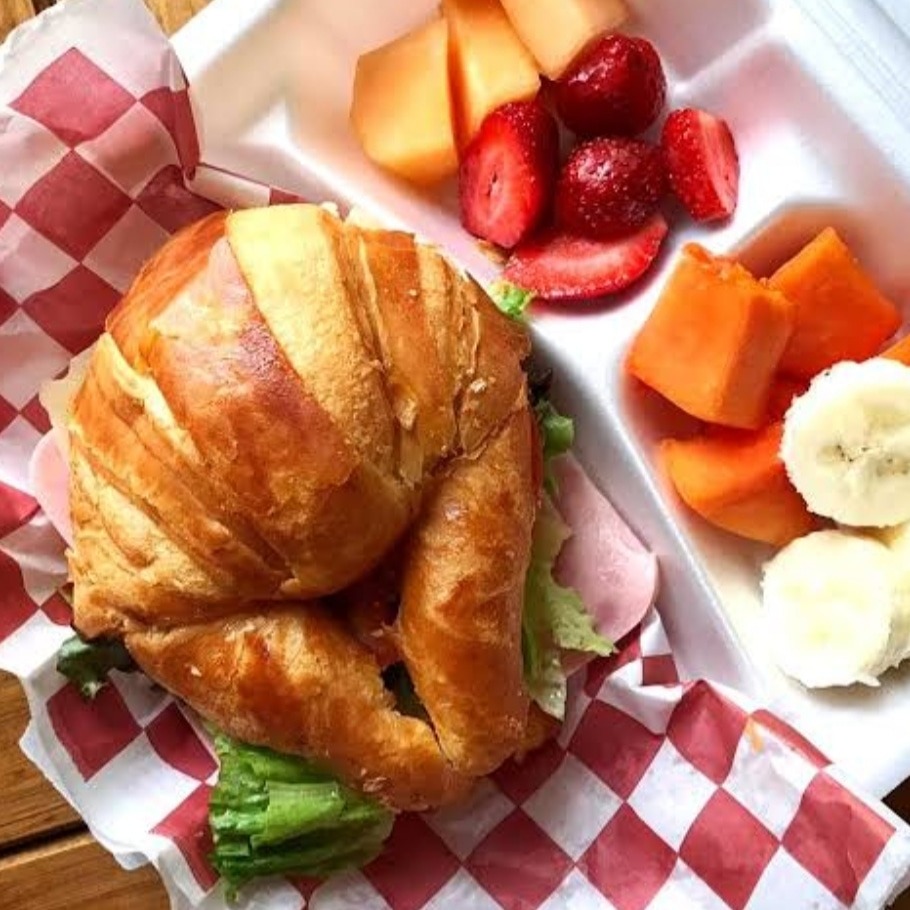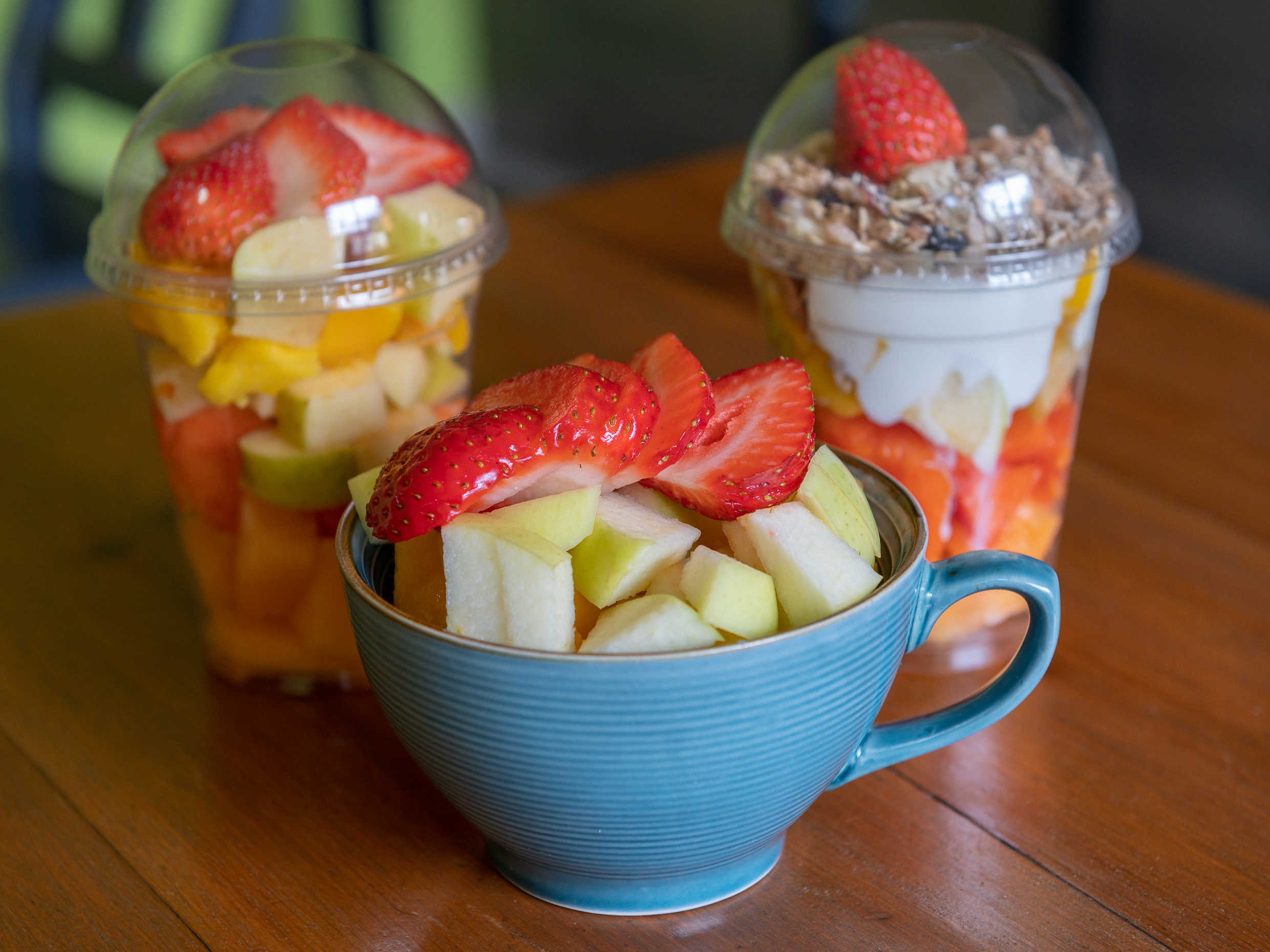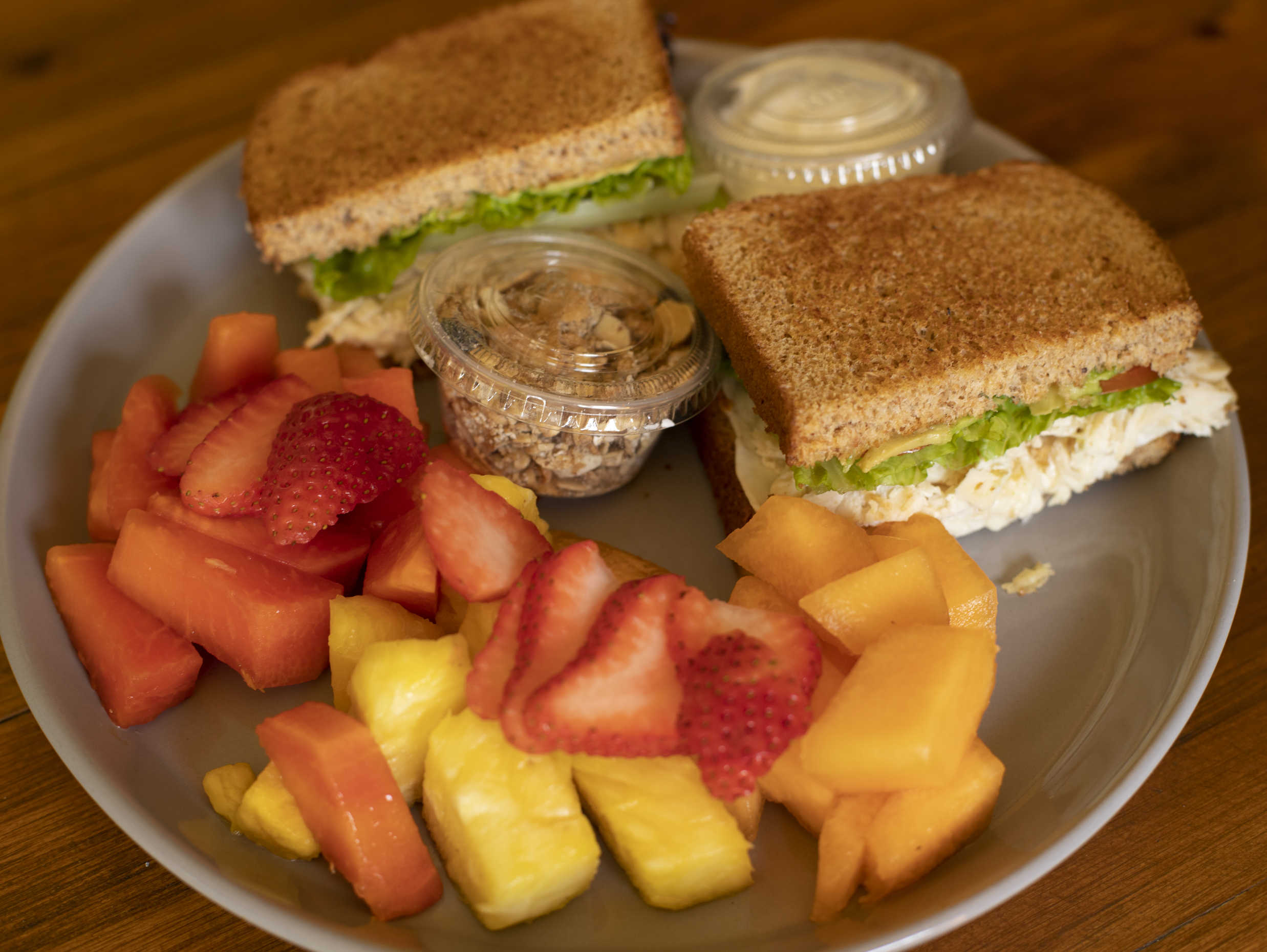 Relleno con pollo, acompañado de dos frutas de temporada, yogúr y granola