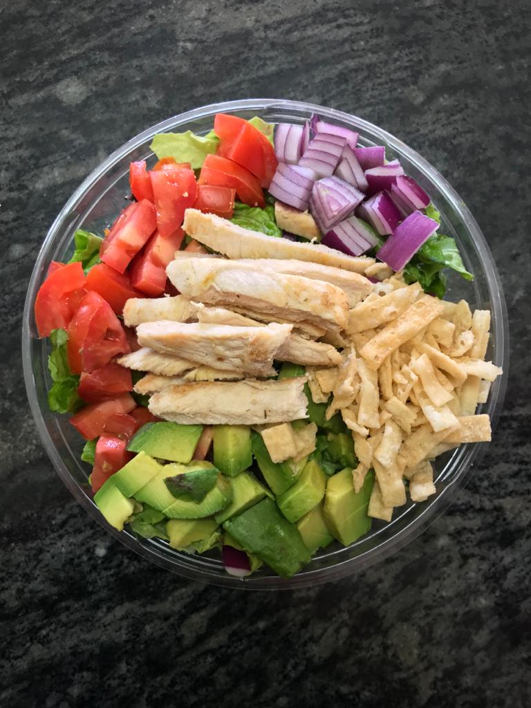 Aguacate, jitomate, cebolla morada, tiras de tortilla, pechuga a la plancha en una cama de lechugas
