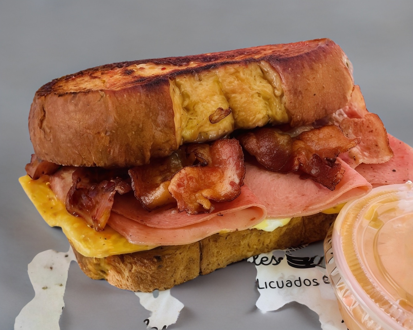 Delicioso sandwich con pan Artesanal Multigrano tostado con mantequilla, huevo, queso americano, jamon york , tocino y un rico aderezo chipotle