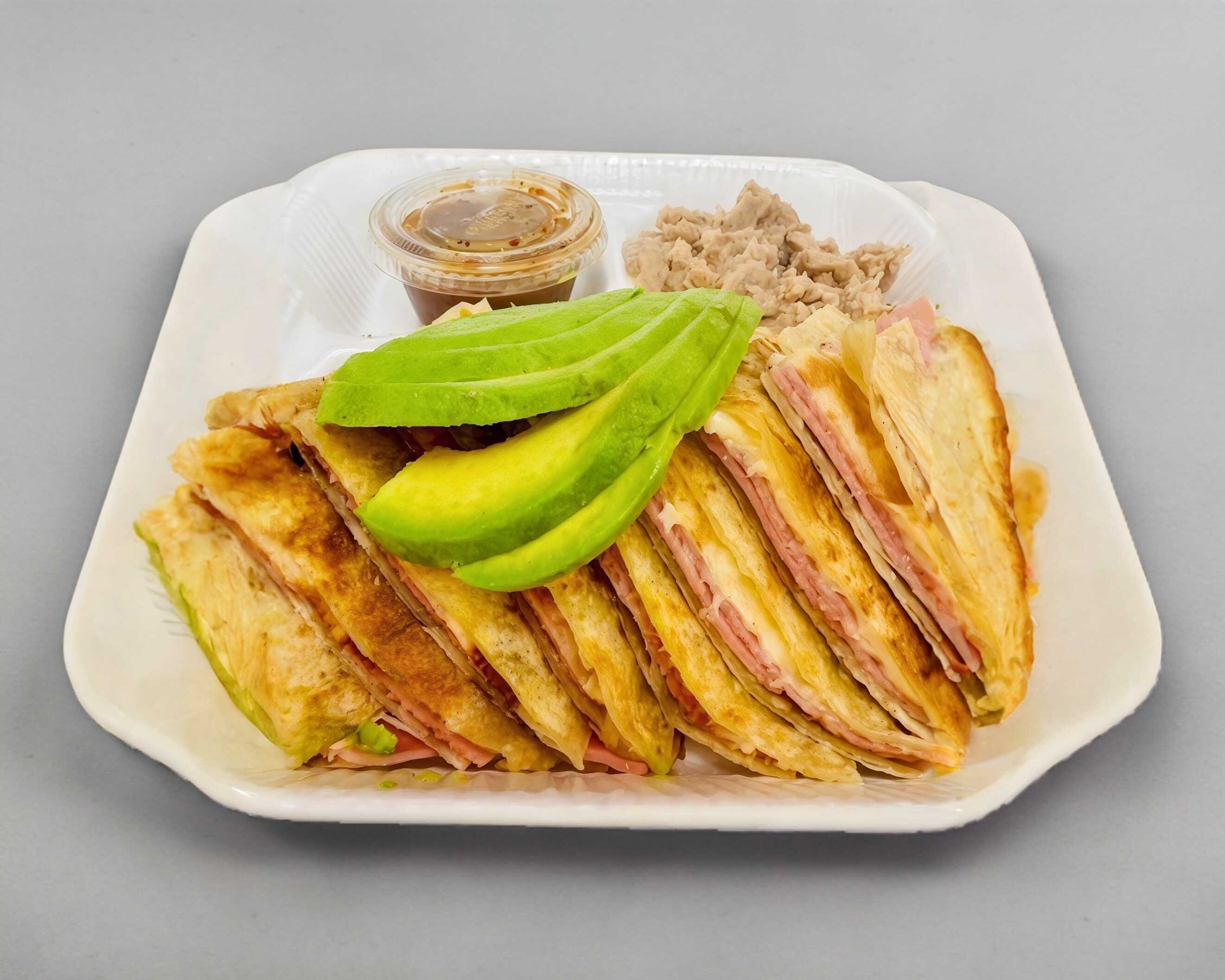 Deliciosas Sincronizadas en tortilla de harina con queso manchego y jamon york acompañado de frijoles, salsa y aguacate
