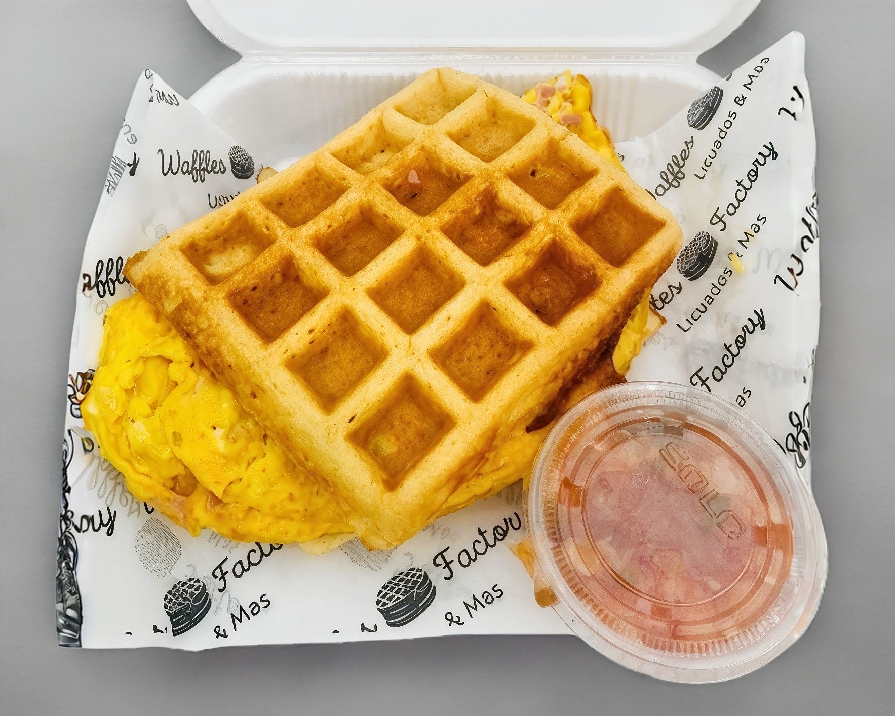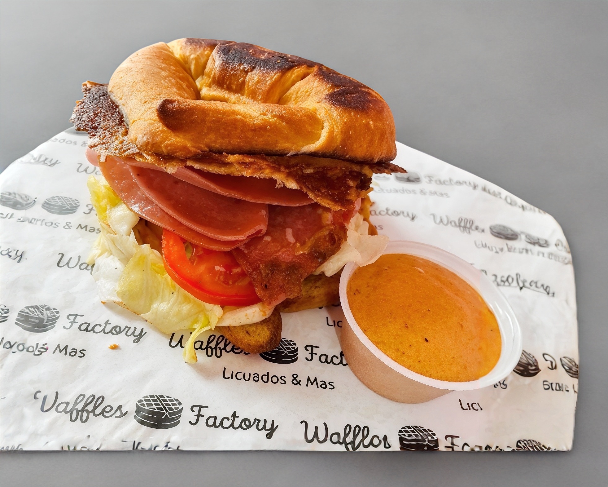 Delicioso waffle salado con pollo empanizado, jamon york, queso manchego,lechuga,tomate y un rico aderezo de chipotle.