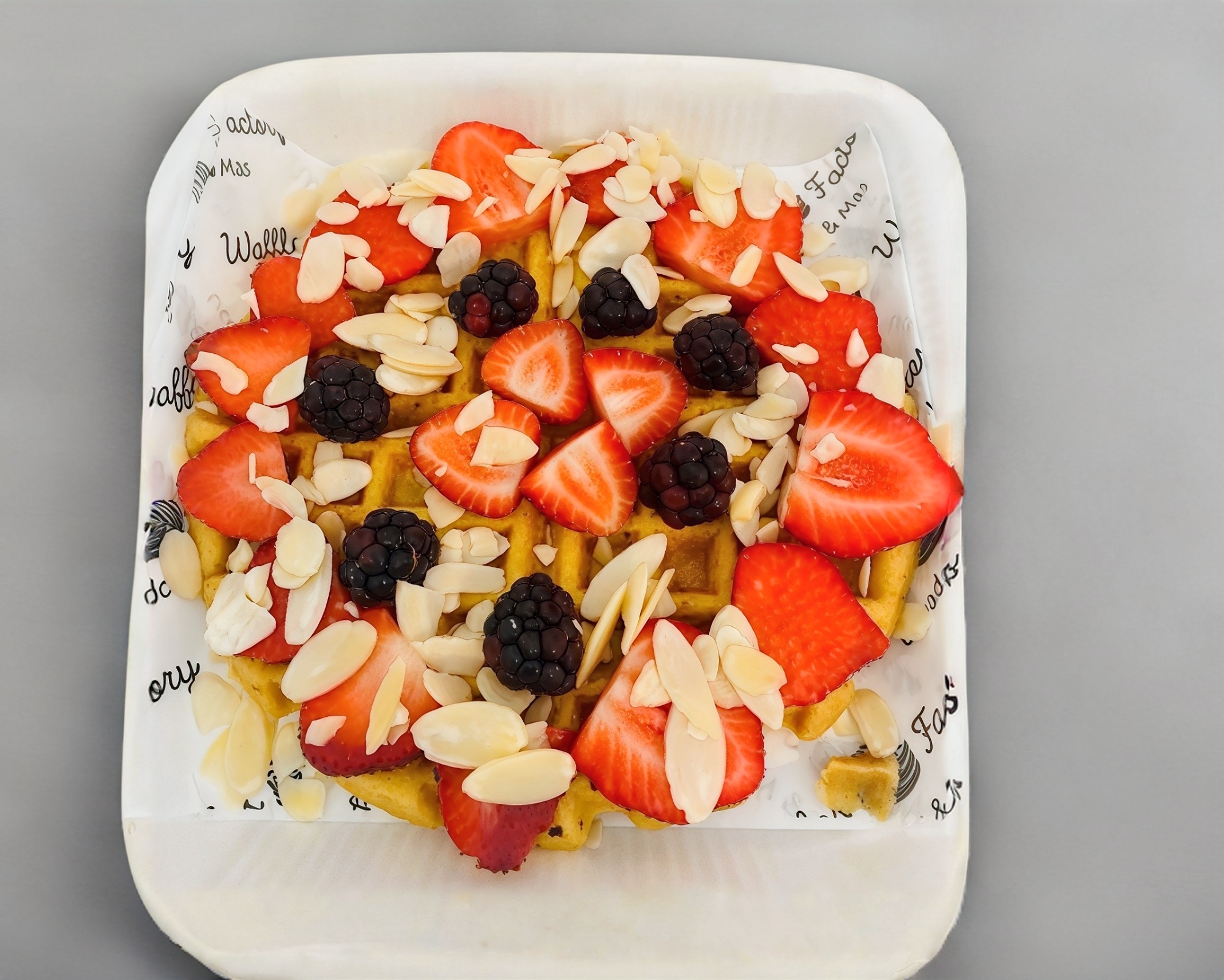 waffle de harina de almendras, fresa, zarzamora, almendra y miel de abeja.