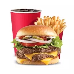 Doble Carne 100% de res, aderezos mayonesa, catsup, verduras frescas cebolla, pepinillos, tomate y lechuga, Acompañado de Papas Medianas y Refresco de 355 ml.