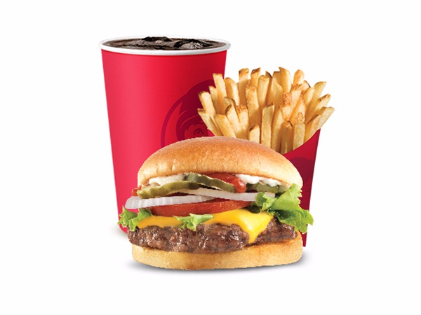 Carne de res de 4 oz acompañada de queso americano, cebolla, pepinillo y cátsup, papas mediana, nuggets de 4 piezas y refresco de 355 ml.