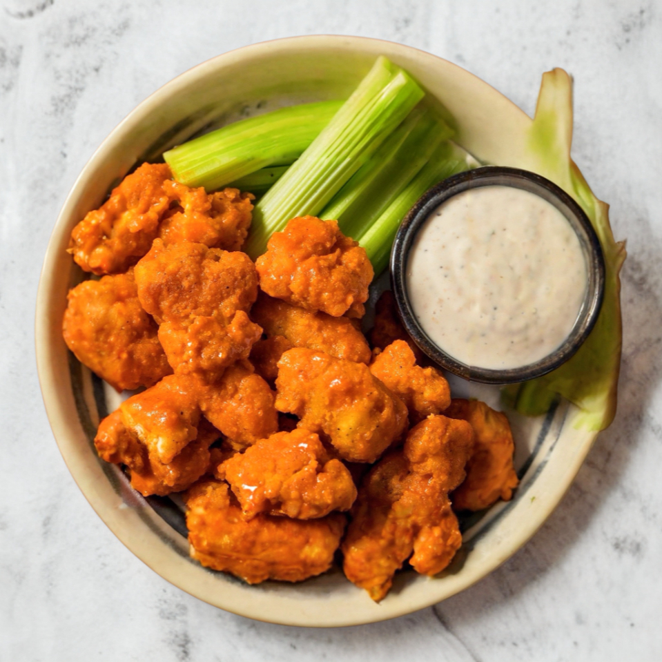 5 Boneless recien hechos bañados al gusto y aderezo ranch.