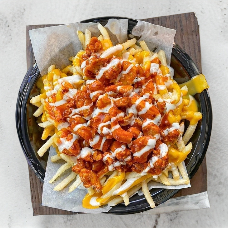 300 g De papa, 200 g de boneless bañados al gusto, queso, cátsup y aderezo ranch.