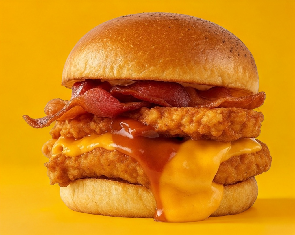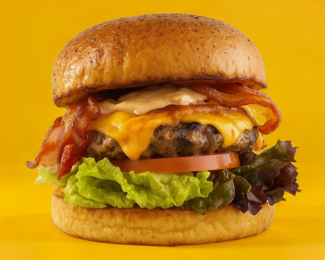 Deliciosa carne de res, costra de queso cubierta con nuestro aderezo de mostaza americana, tiras de tocino crujiente y verdura fresca.