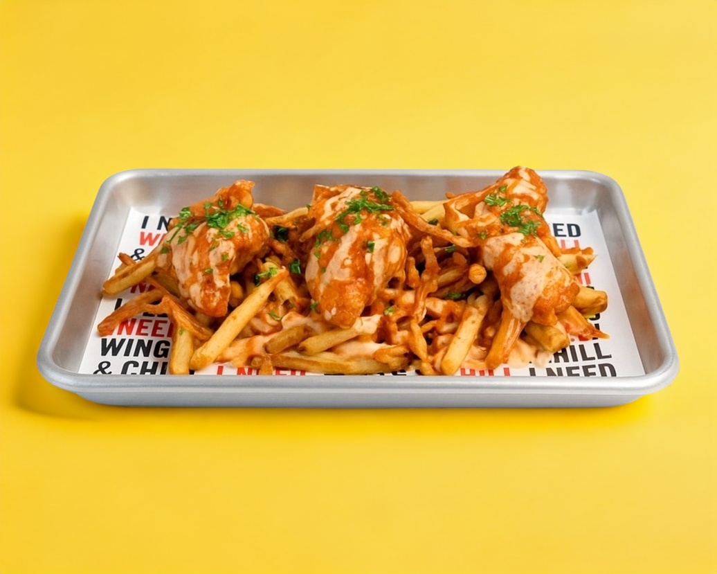Papas fritas (250 gr) con nuestra salsa de queso americano, salsa búfalo y tocino.