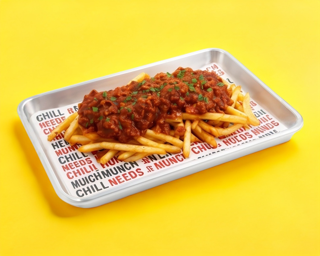 Cama de papas fritas bañadas en salsa bbq-chipotle, acompañados de nuestro chilli tex-mex y tocino picado.