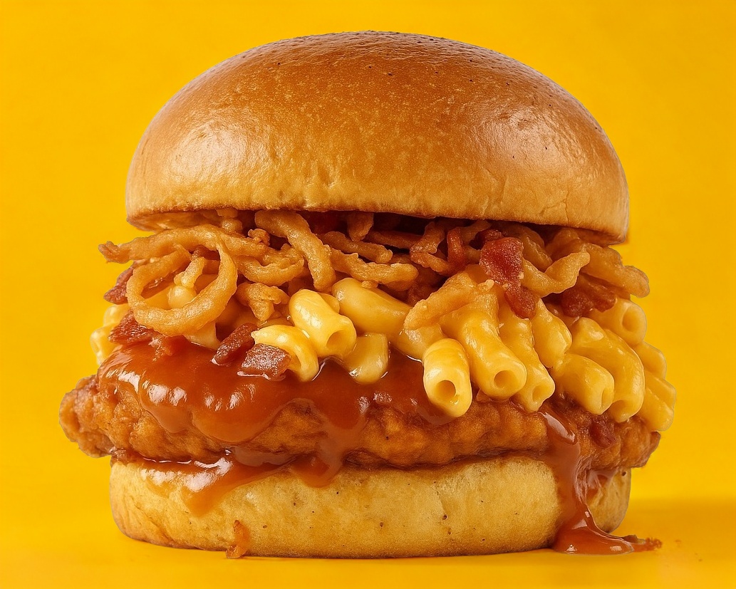 Pechuga de pollo crunch bañada en salsa búfalo de la casa. Macarrones con queso, tocino, cebollas crispy, en nuestro pan de mantequilla y finas hierbas. Incluye papas fritas, acompañado con jalapeños en rodajas