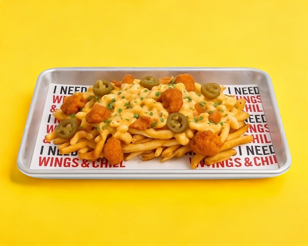 Cama de Papas fritas con nuestro mac&cheese, chiles jalapeños en rodajas, aderezo chipotle y palomitas de pollo en nuestra receta cajún.