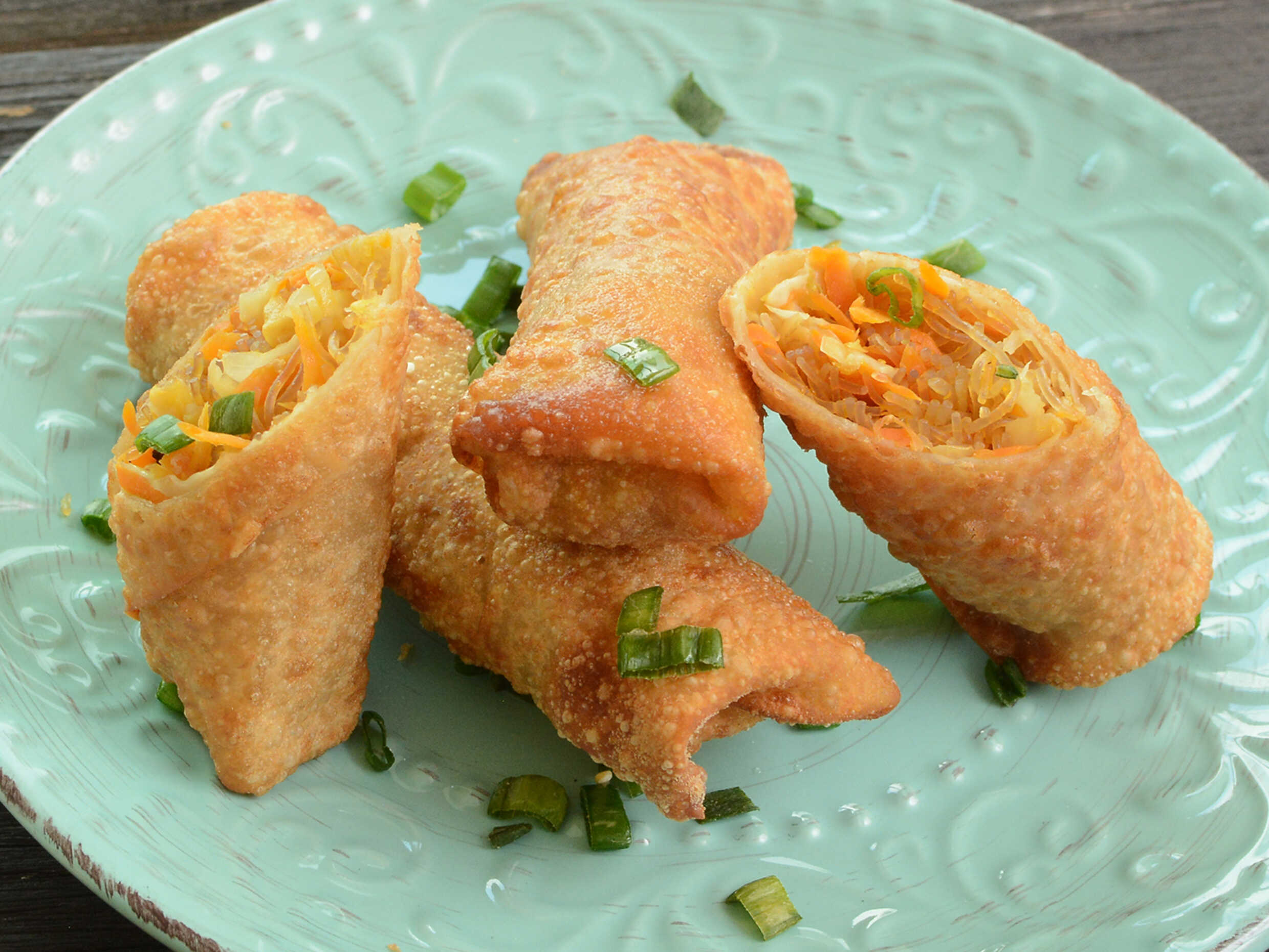 Rollitos fritos rellenos de zanahoria, col y fideos chinos. Acompañados de aderezo chipotle.