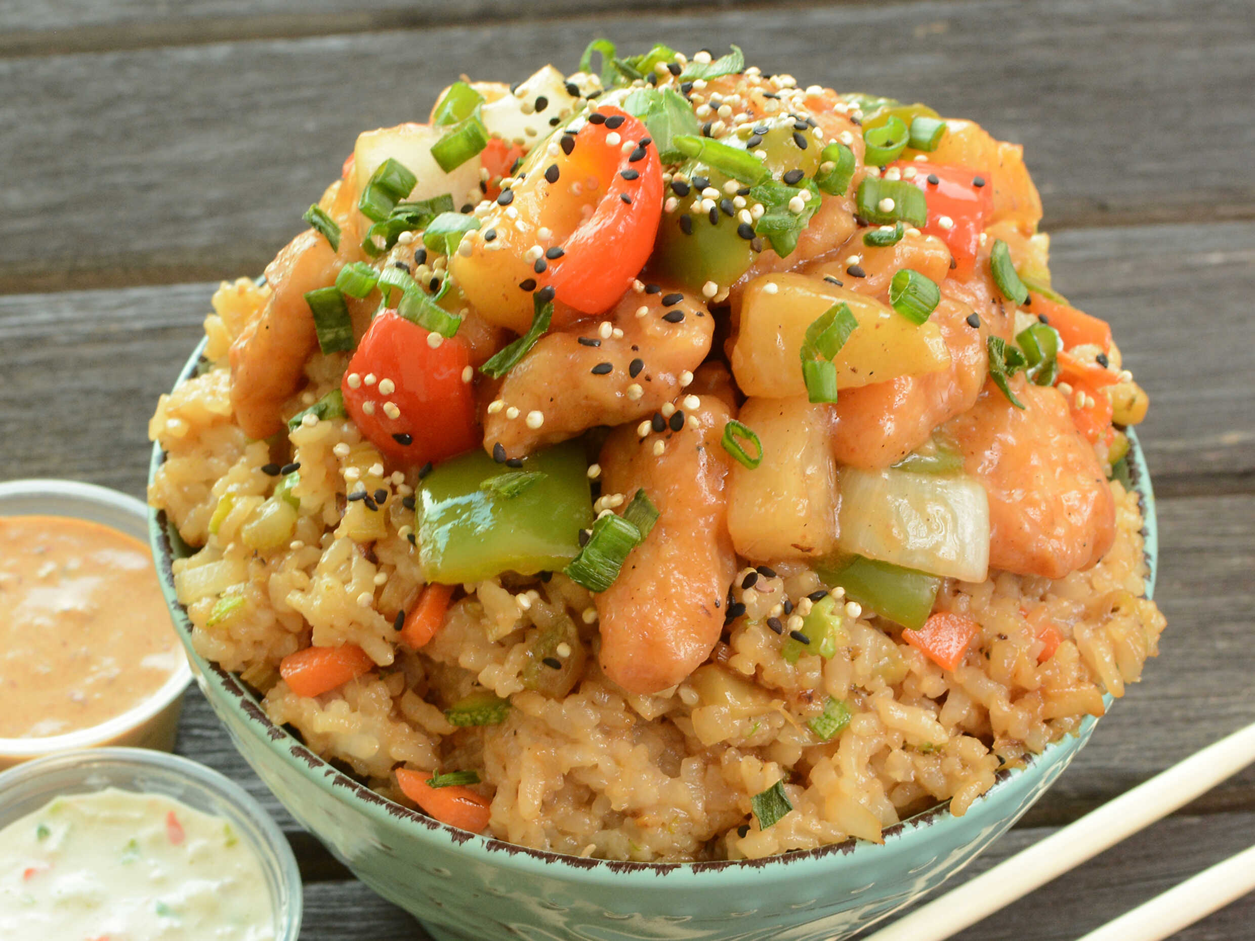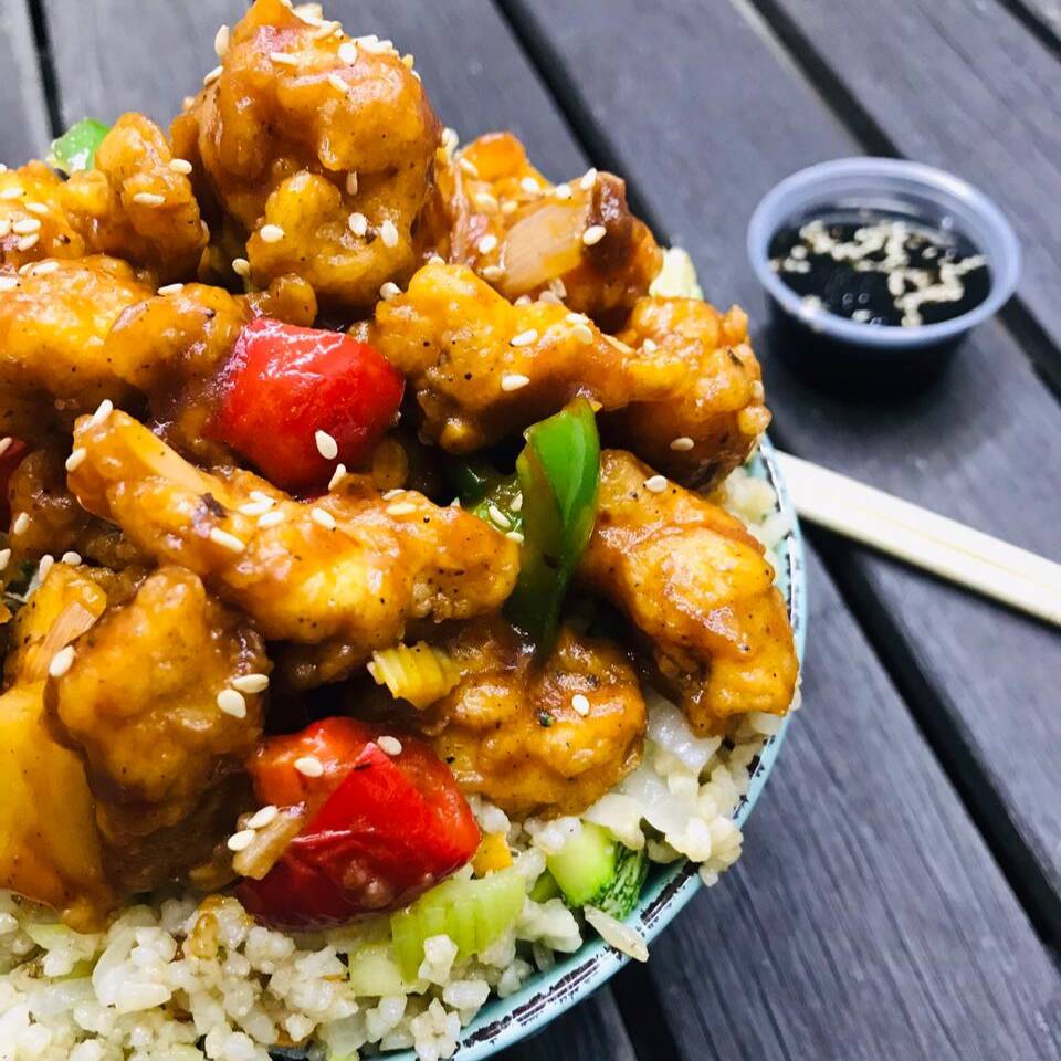 Pollo capeado salteado en nuestra deliciosa salsa agridulce, con una mezcla de pimientos, cebolla y trocitos de piña sobre arroz frito