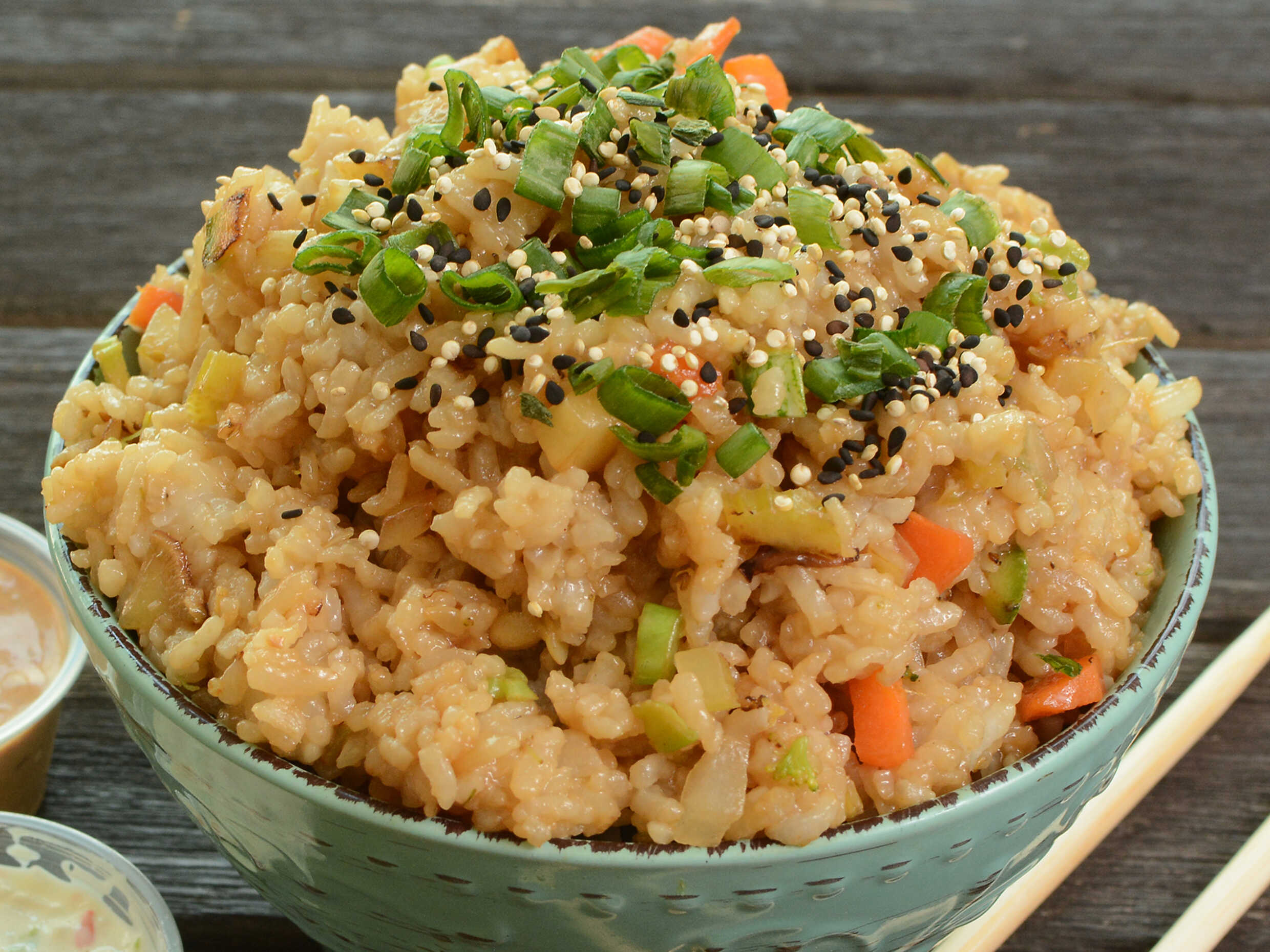 Arroz oriental con verduras, acompañado de salsa de soya