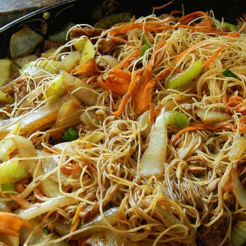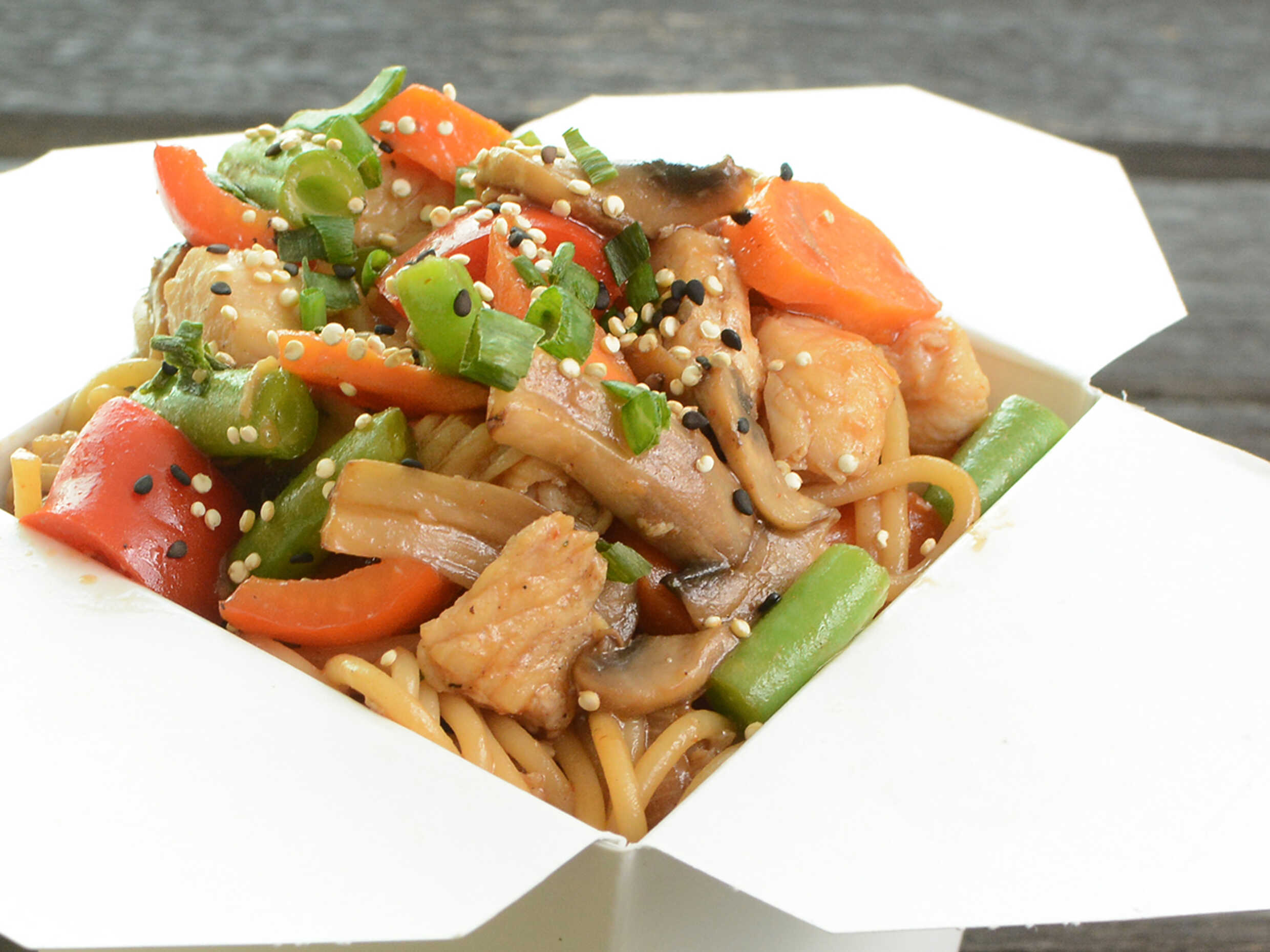 Lo mein a base de fideos con pollo, champiñones, pimientos, y zanahoria, salteados en una salsa agridulce y soya