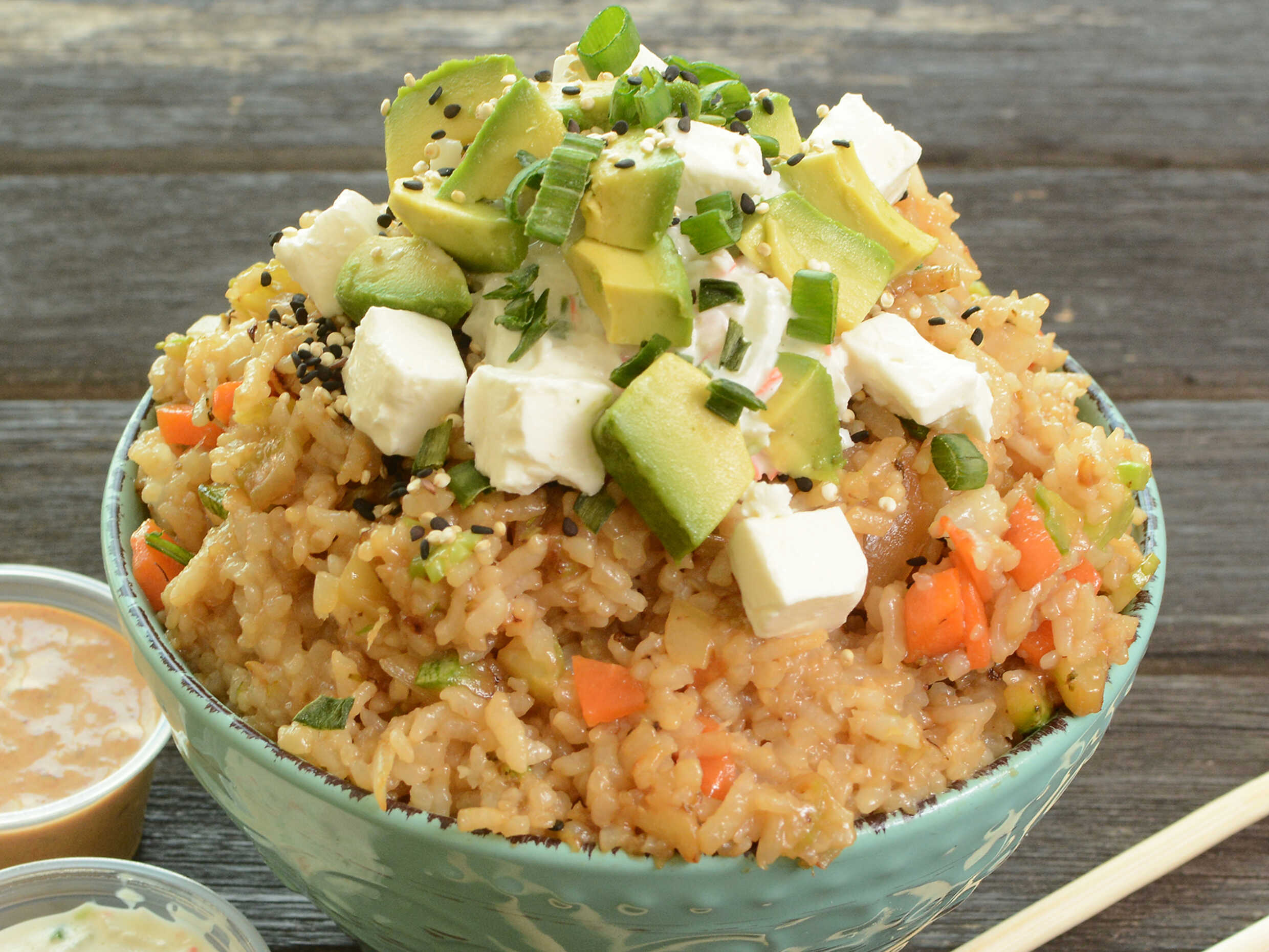 Arroz frito con verduras, surimi, trocitos de queso crema y aguacate. Acompañado de aderezo chipotle