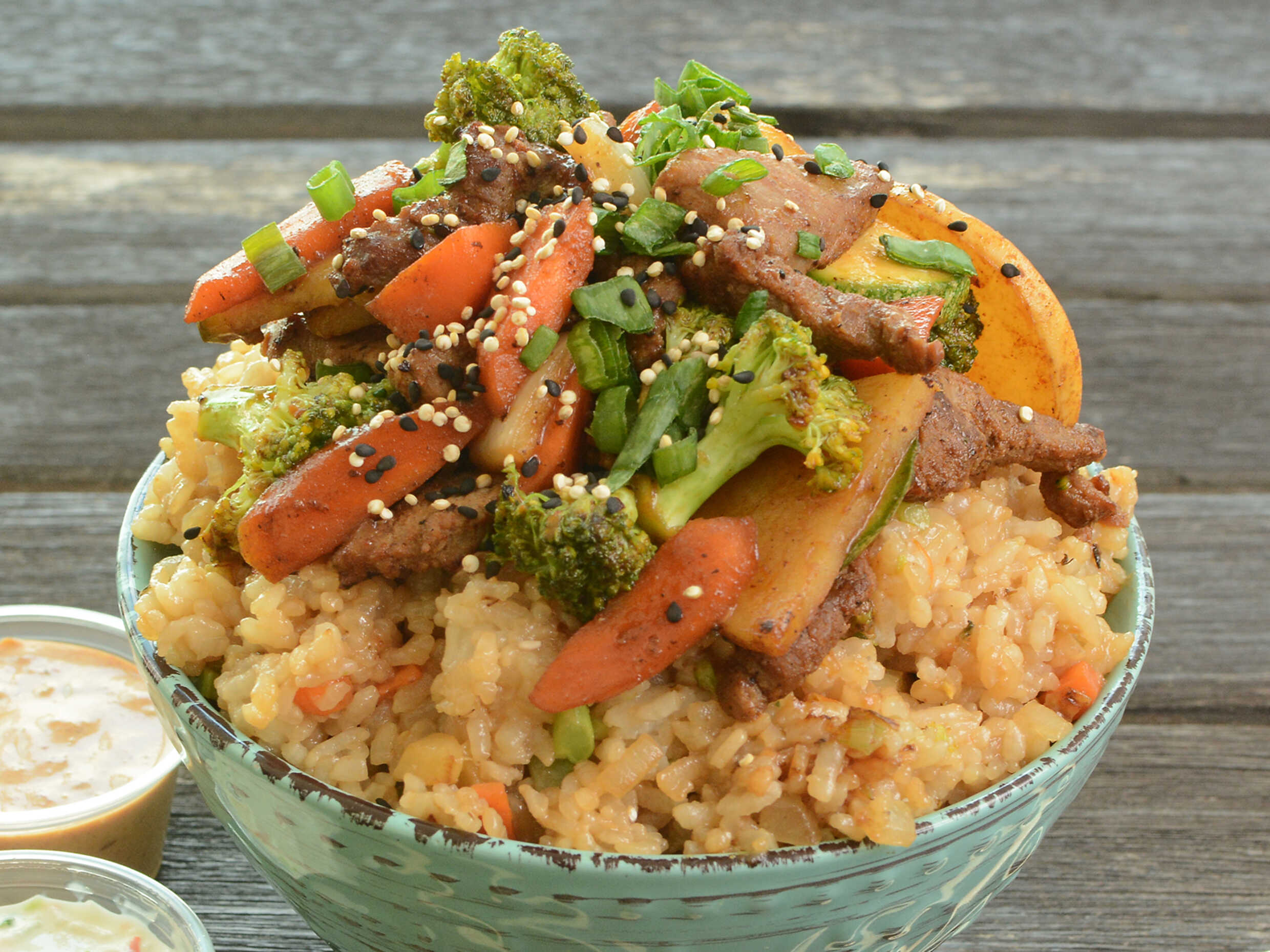 Tiras de res salteadas con nuestra salsa estilo Sambal. Acompañada con cebolla, brócoli, zanahoria, papa y calabaza. Servido sobre una base de arroz frito