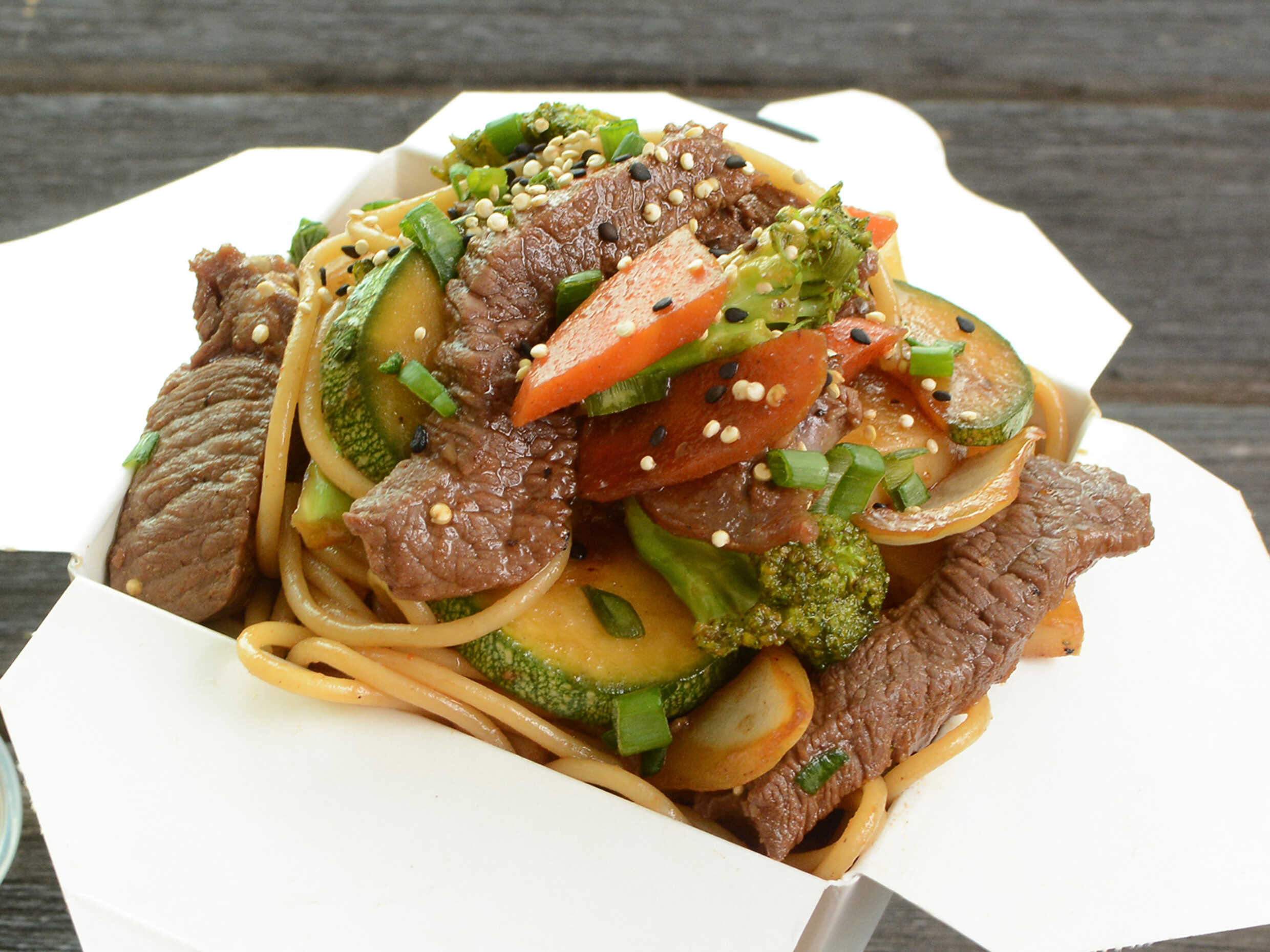 Mezcla de fideos chinos, res, brócoli, cebolla, calabaza, papa y zanahoria, en salsa media picosita y Hoisin