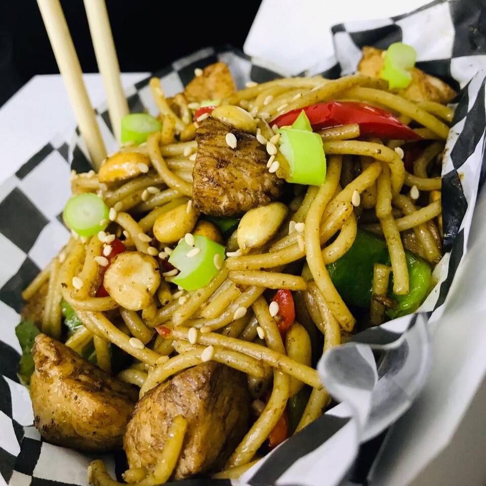 Mezcla de pasta oriental, pollo en salsa Kung Pao, pimientos, calabaza, y cacahuate con un toque picosito de chile de árbol