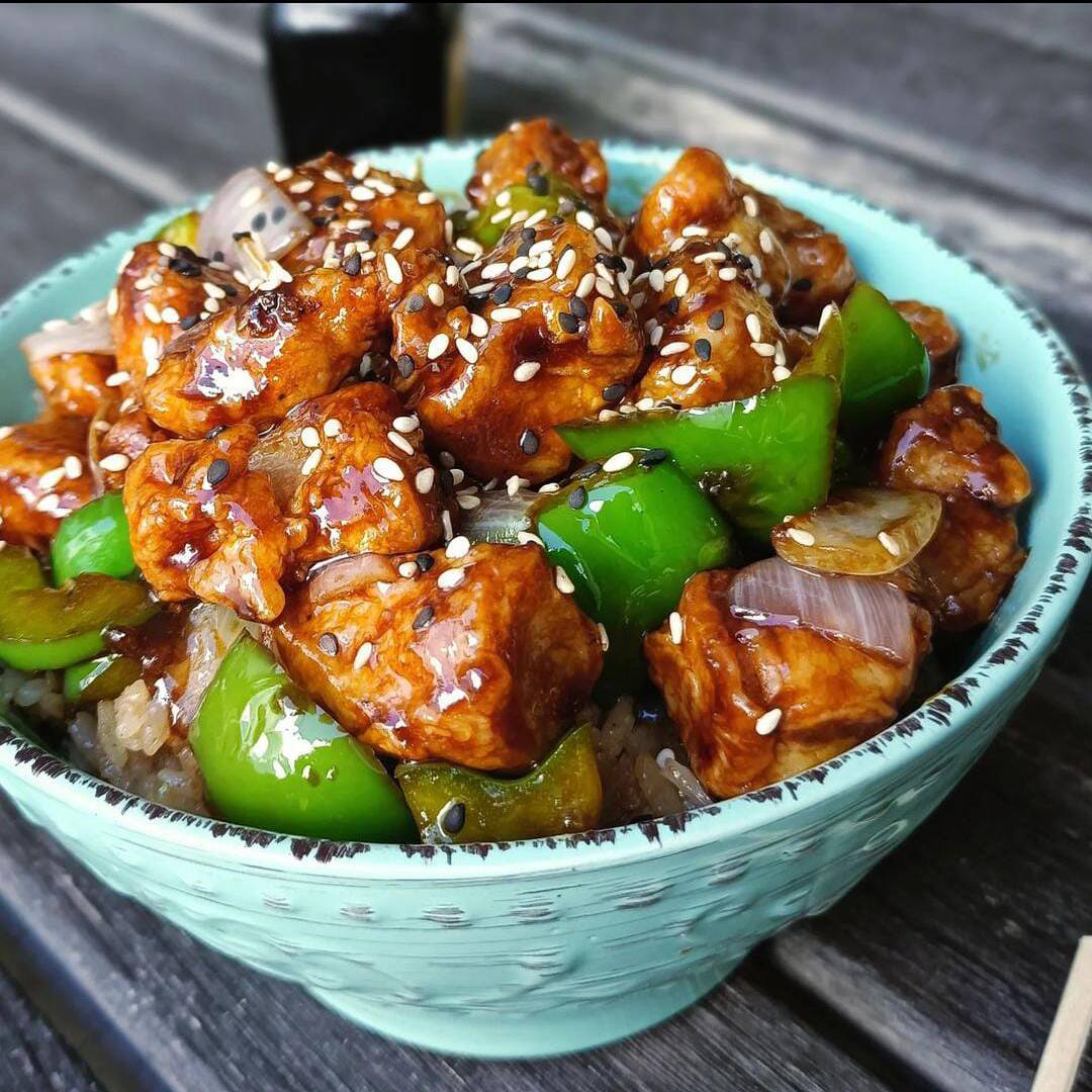 Trocitos de pollo con nuestra salsa clásica Teriyaki , acompañado de cebolla, ejote y pimientos. Sobre arroz frito