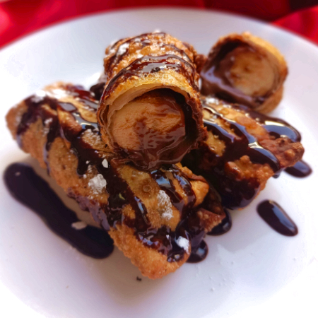 Egg rolls rellenos de plátano y Nutella, espolvoreados con azúcar flameada