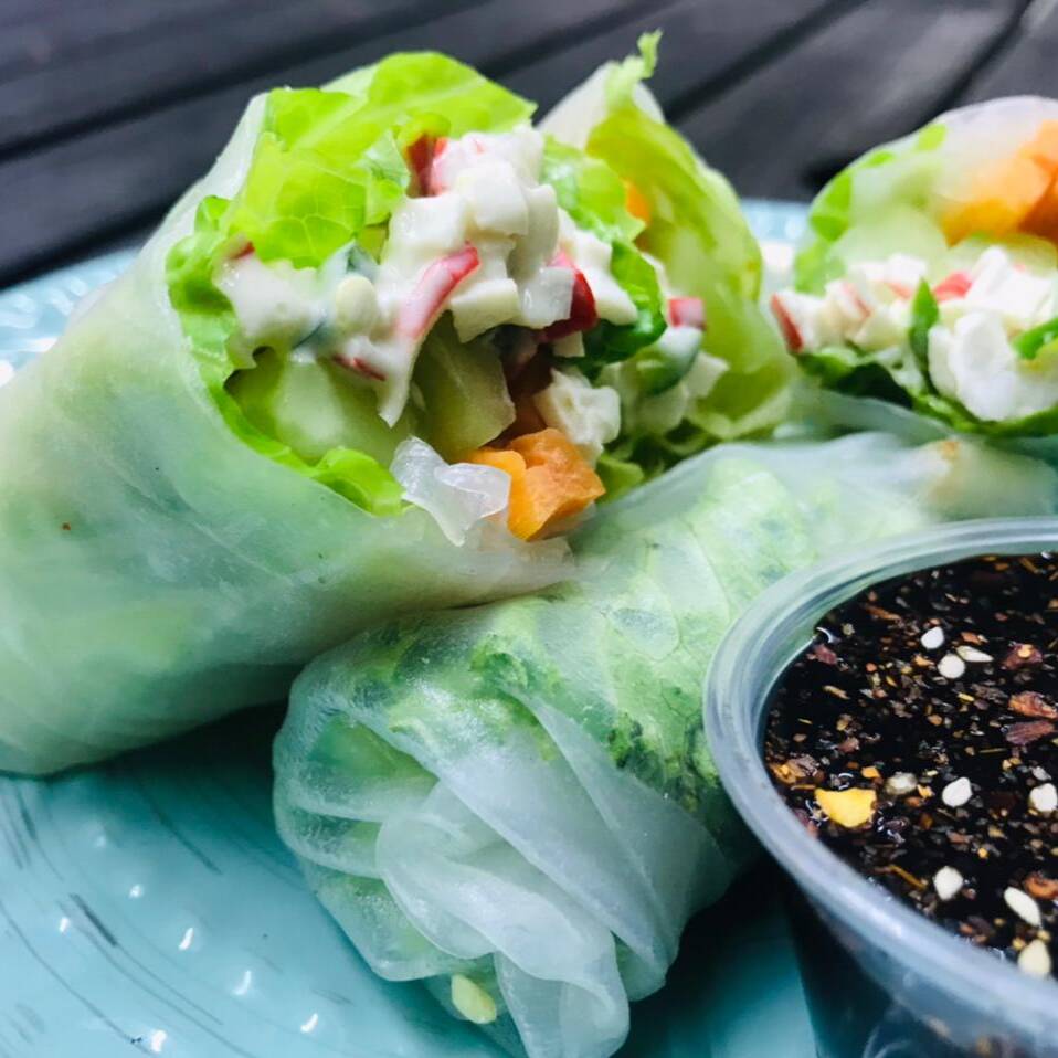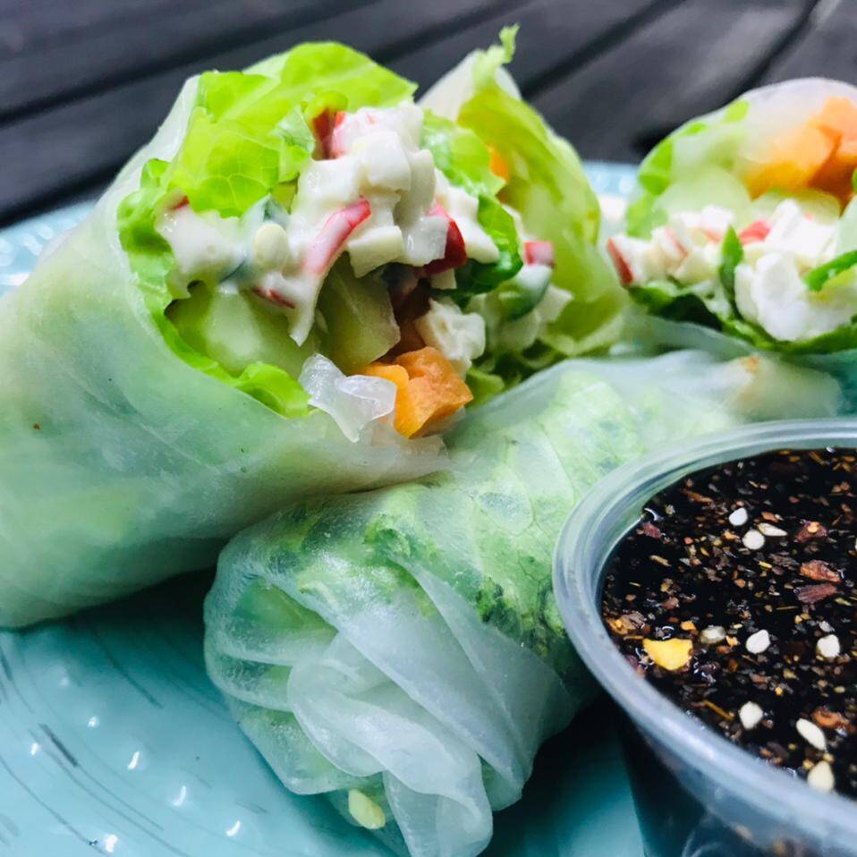 Rollitos fríos de papel de arroz rellenos de surimi y verduras. Acompañados de aderezo chipotle