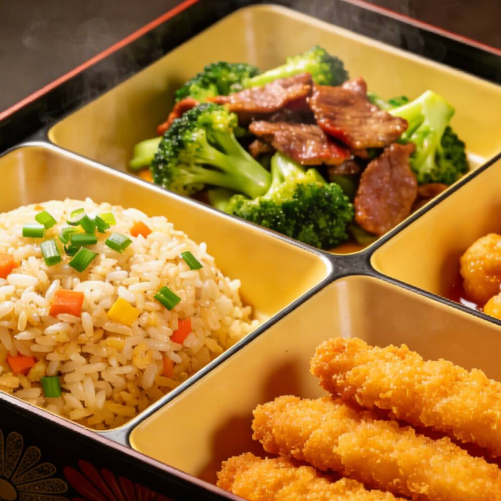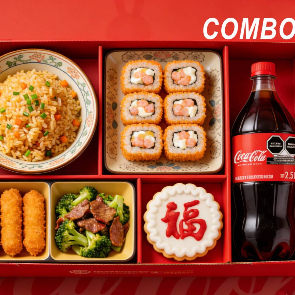 PLATO CON ARROZ O ESPAGUETI (3 GUISO)*1 + ARROZ FRITO*1 + SUSHI DE CAMARÓN EMPANIZADO (8 PIEZAS, CON SOJA)*1 + COCA-COLA 2.5 ML*1 + GALLETAS DE LA FORTUNA CHINAS (COLOR AL AZAR)*3