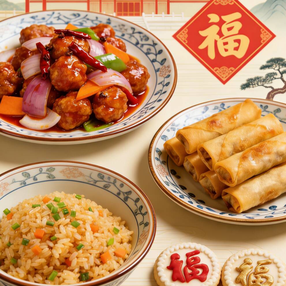 PLATO CON ARROZ O ESPAGUETI (1 GUISO)*1 + ROLLITOS PRIMAVERA*1 + GALLETAS DE LA FORTUNA CHINAS (COLOR AL AZAR)*1