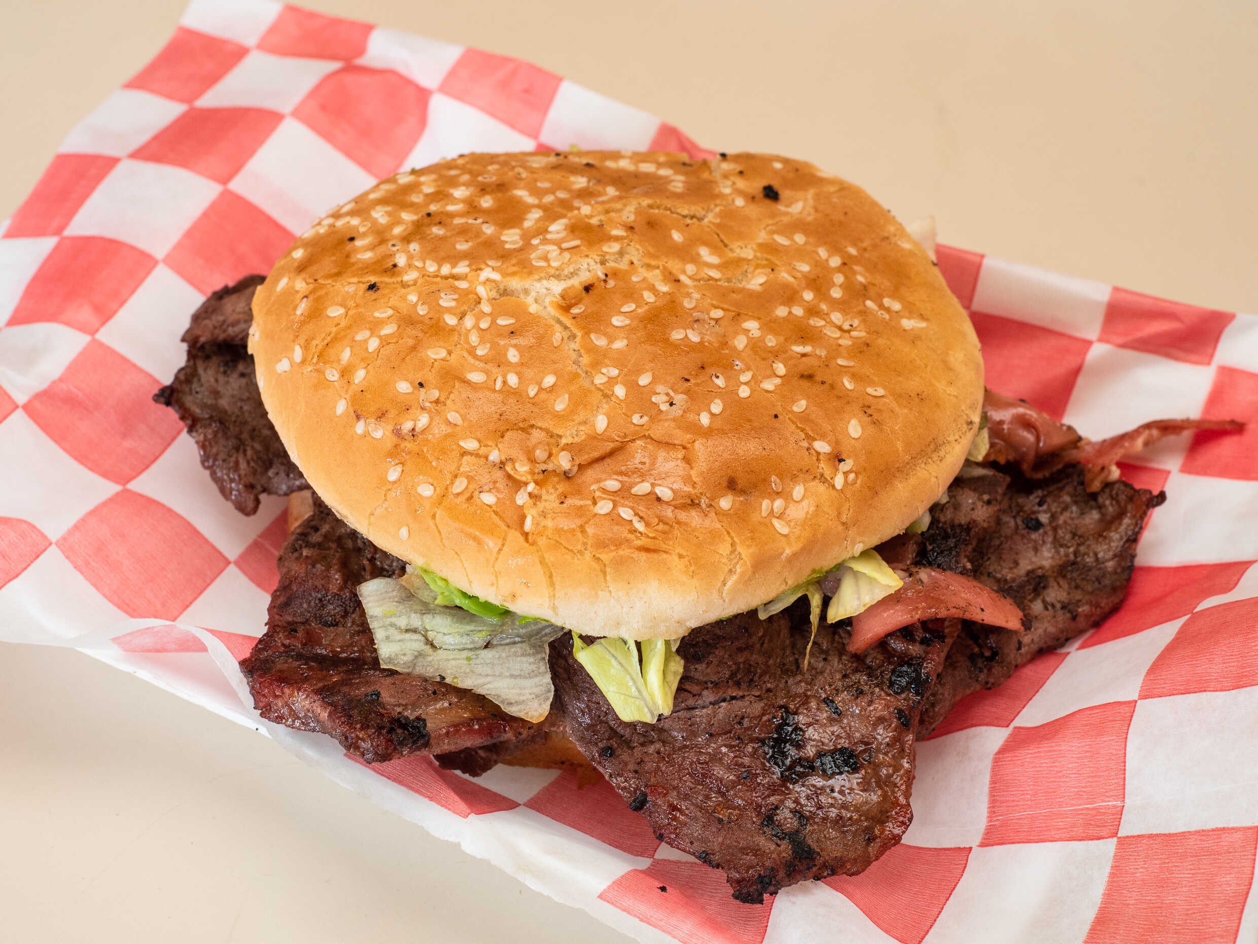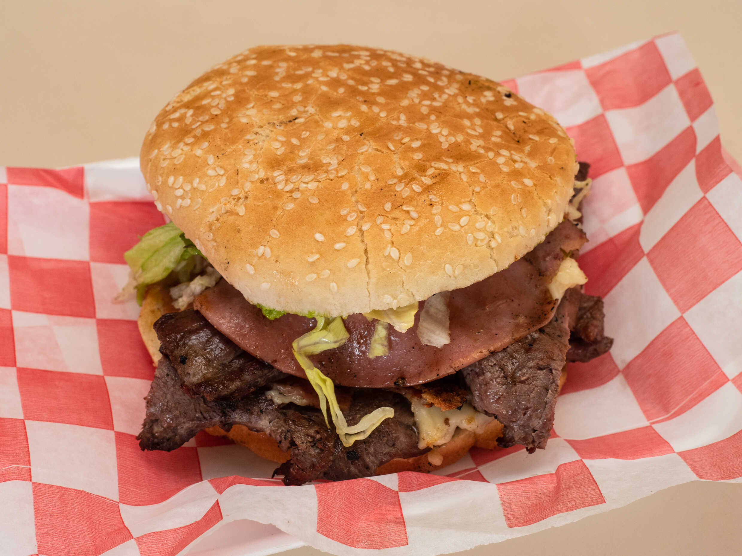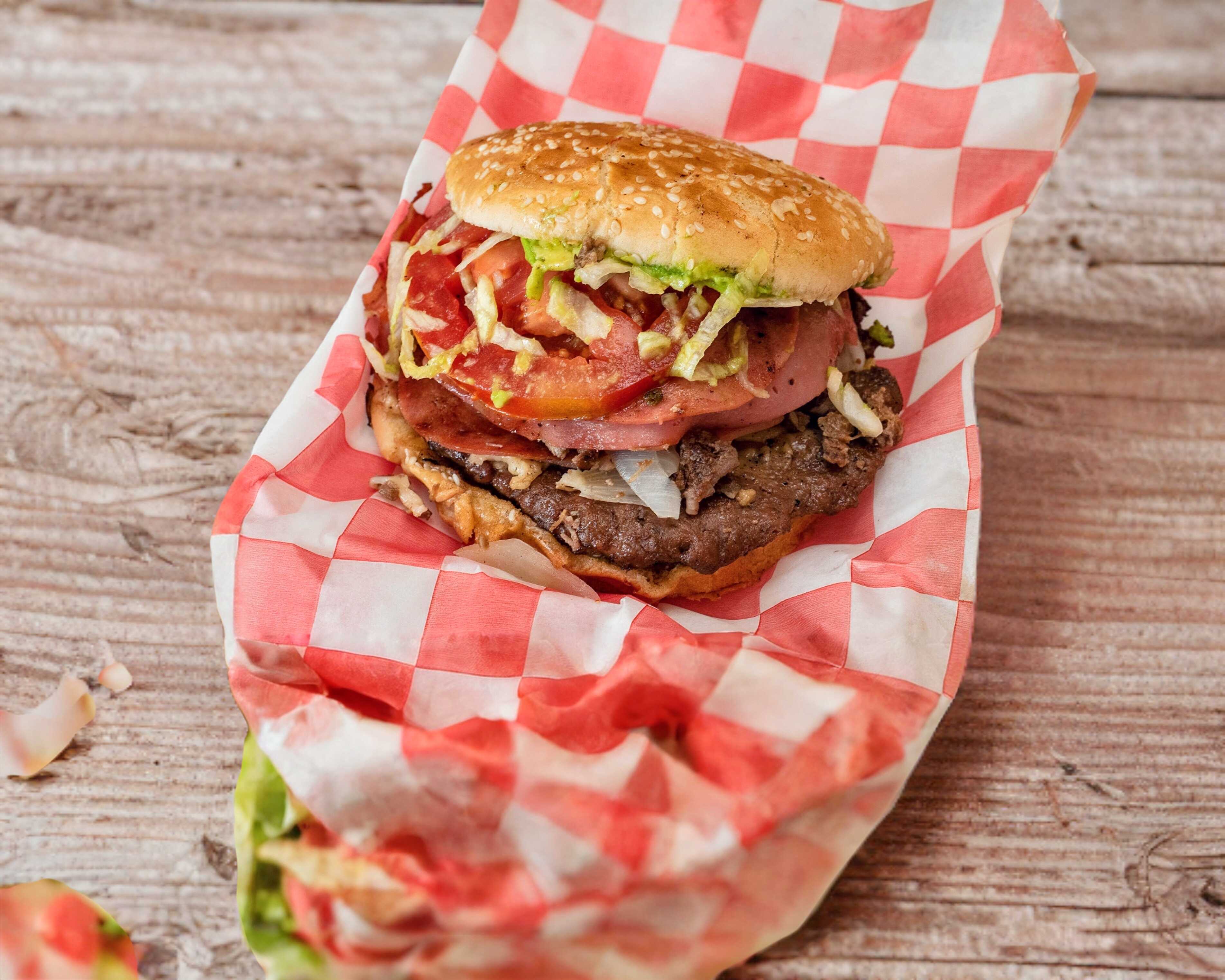 Lleva 2 carnes de hamburguesa, queso asadero, jamón, salami, aguacate, tomate, lechuga, mayonesa, mostaza, sobre de cátsup y sobre de chiles.